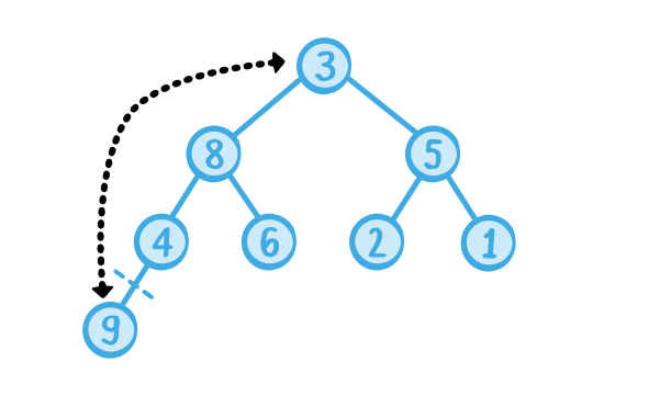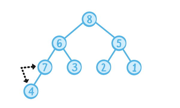 (maxheap이기 때문에 자식들 중 더 우선순위가 높은(값이 큰) 8과 swap하는 모습이다.)