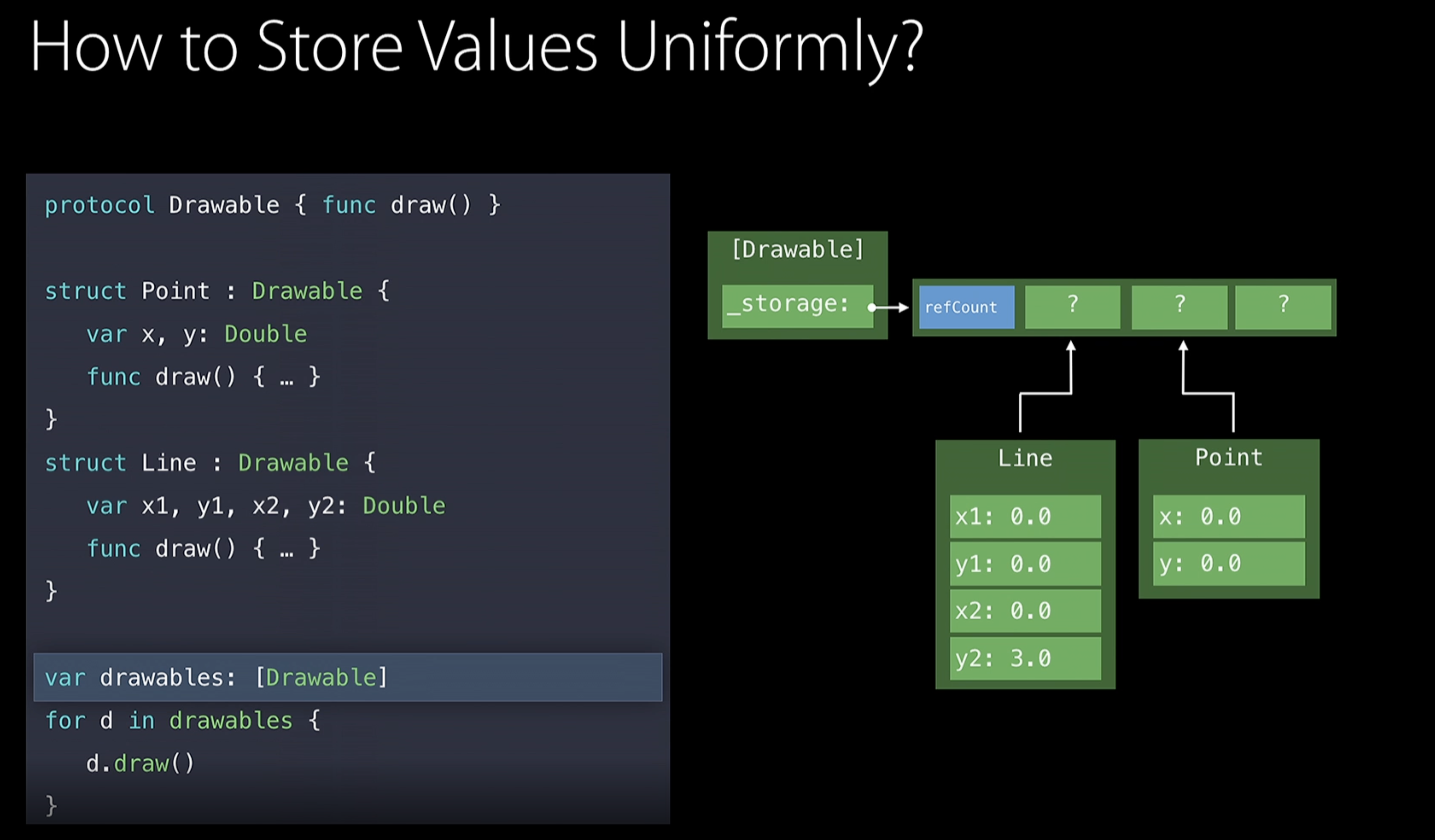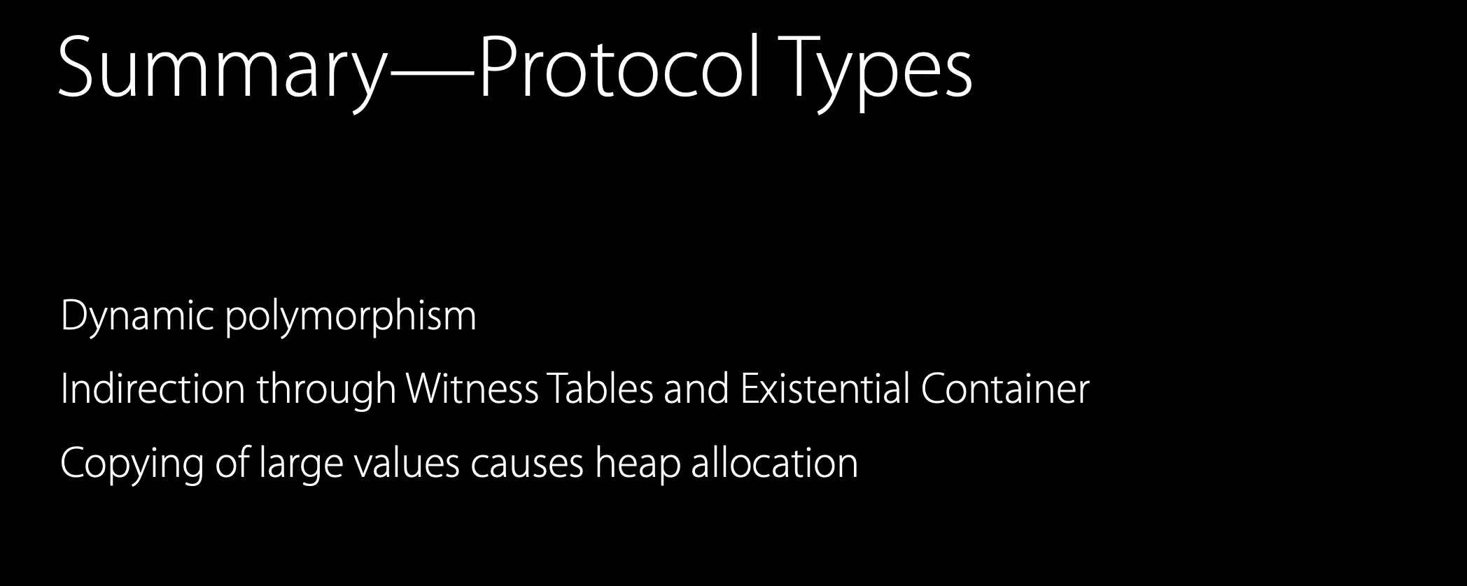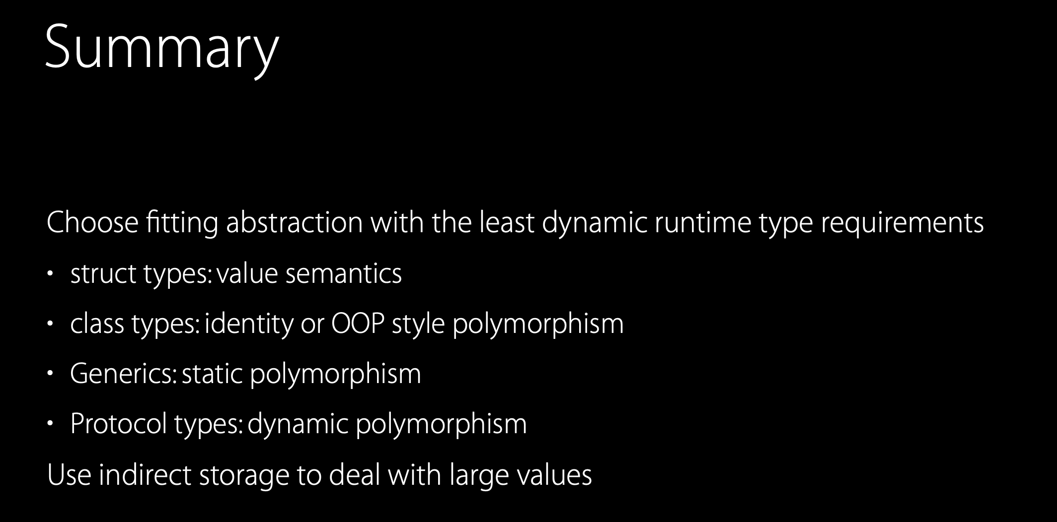 - 동적인 다형성이 필요하다면?? protocol 타입들과 value 타입들을 결합해서 value semantics를 여전히 사용하면서도! class에 비해 빠른 코드를 얻을 수 있다.