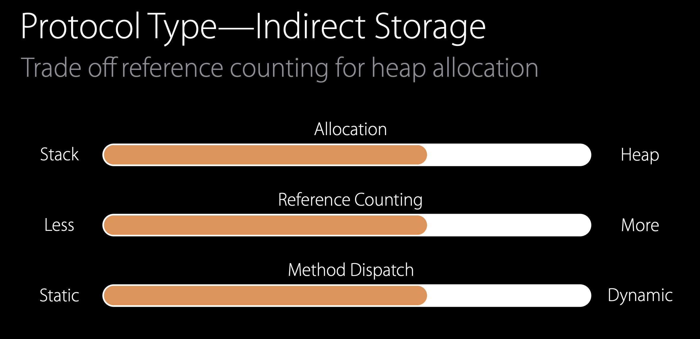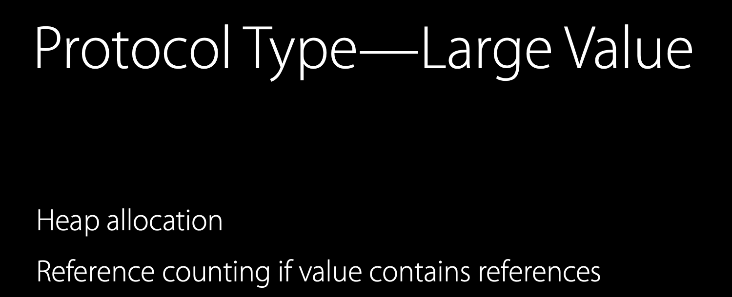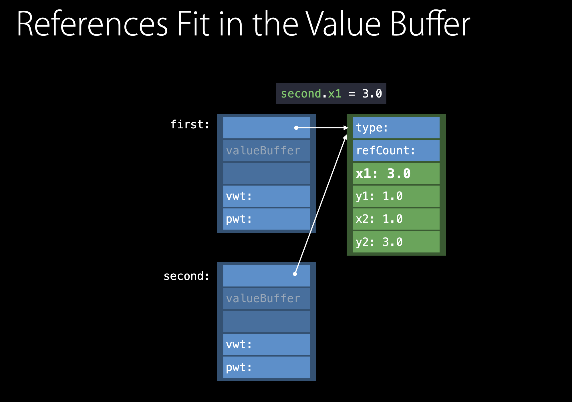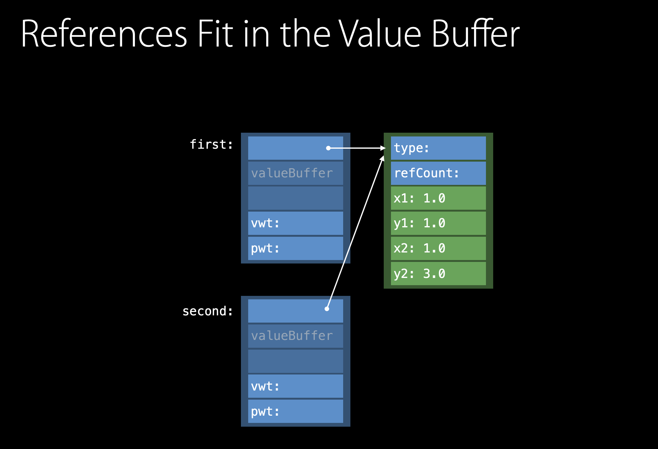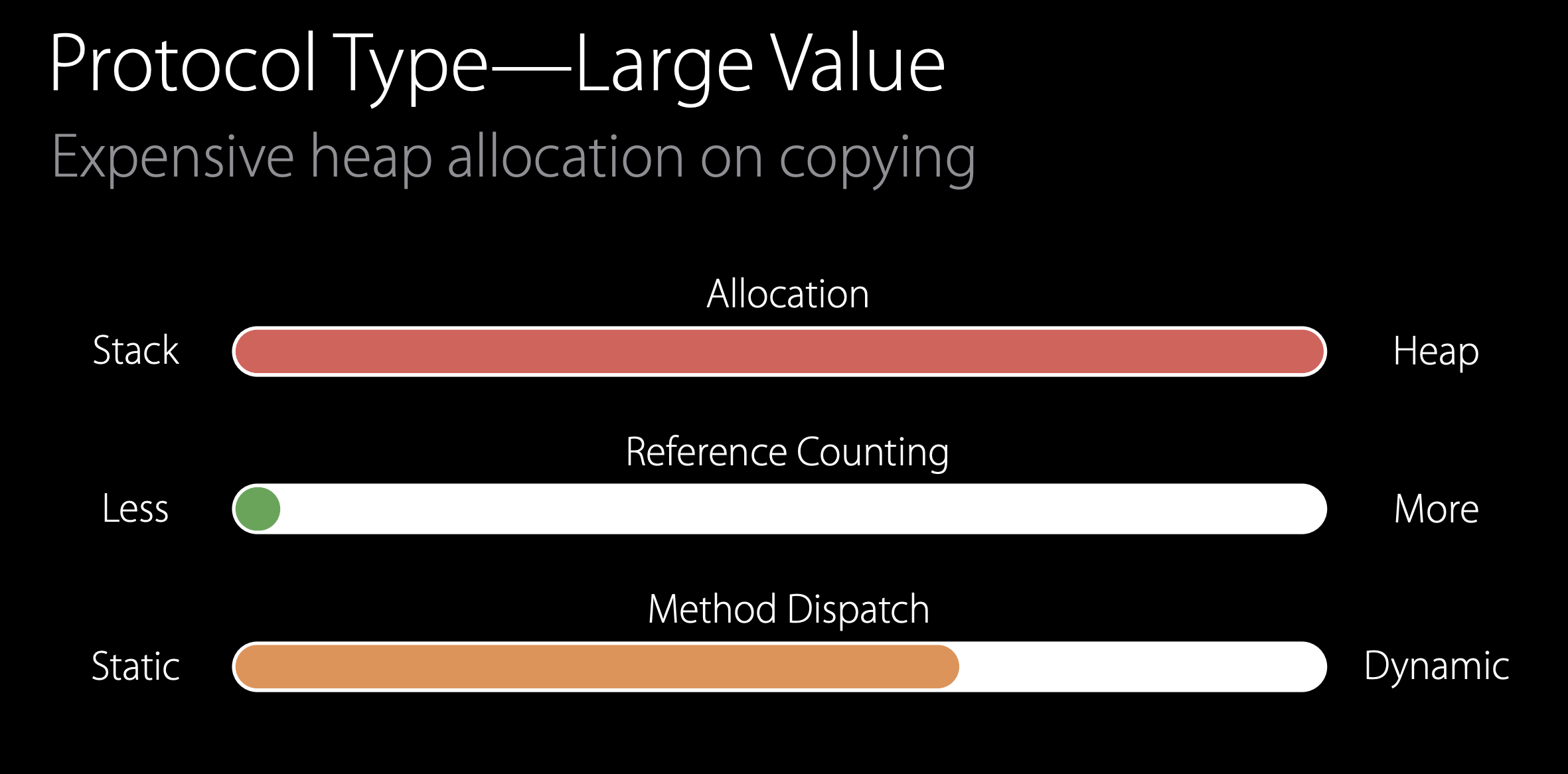 - 큰 값에 참조가 포함된 경우 reference counting이 생기고, dynamic dispatch의 힘을 얻는다. 즉, 코드 전체에서 하나의 구현을 공유할 수 있다