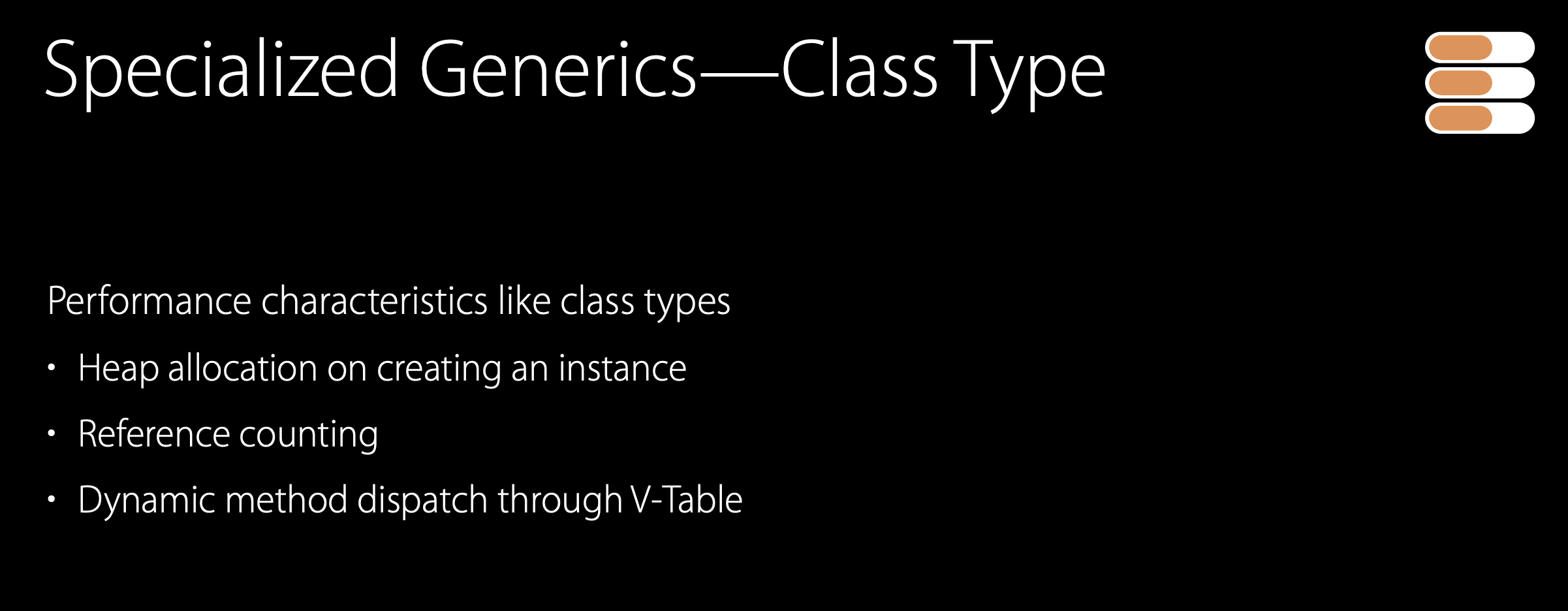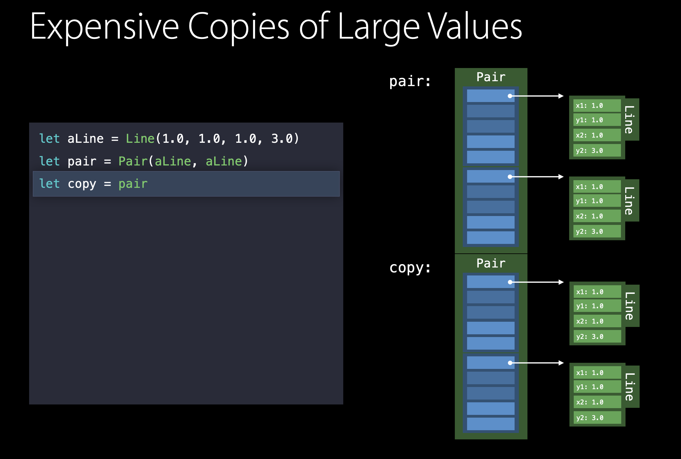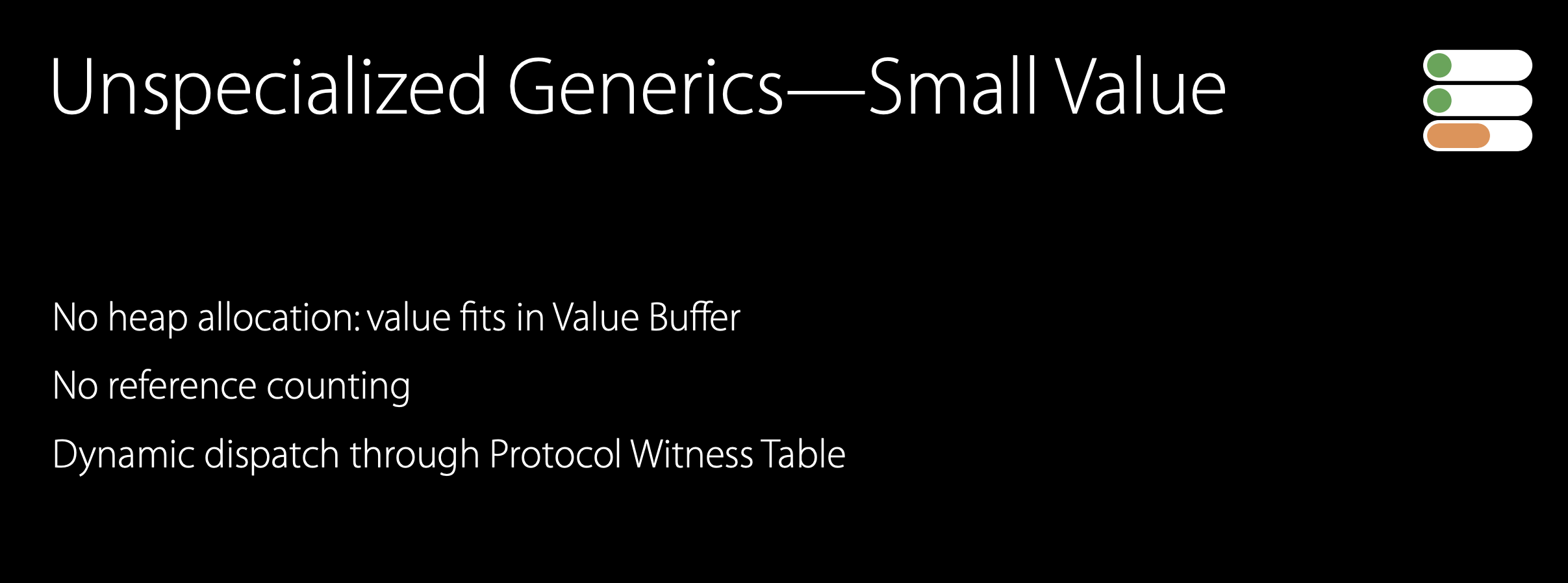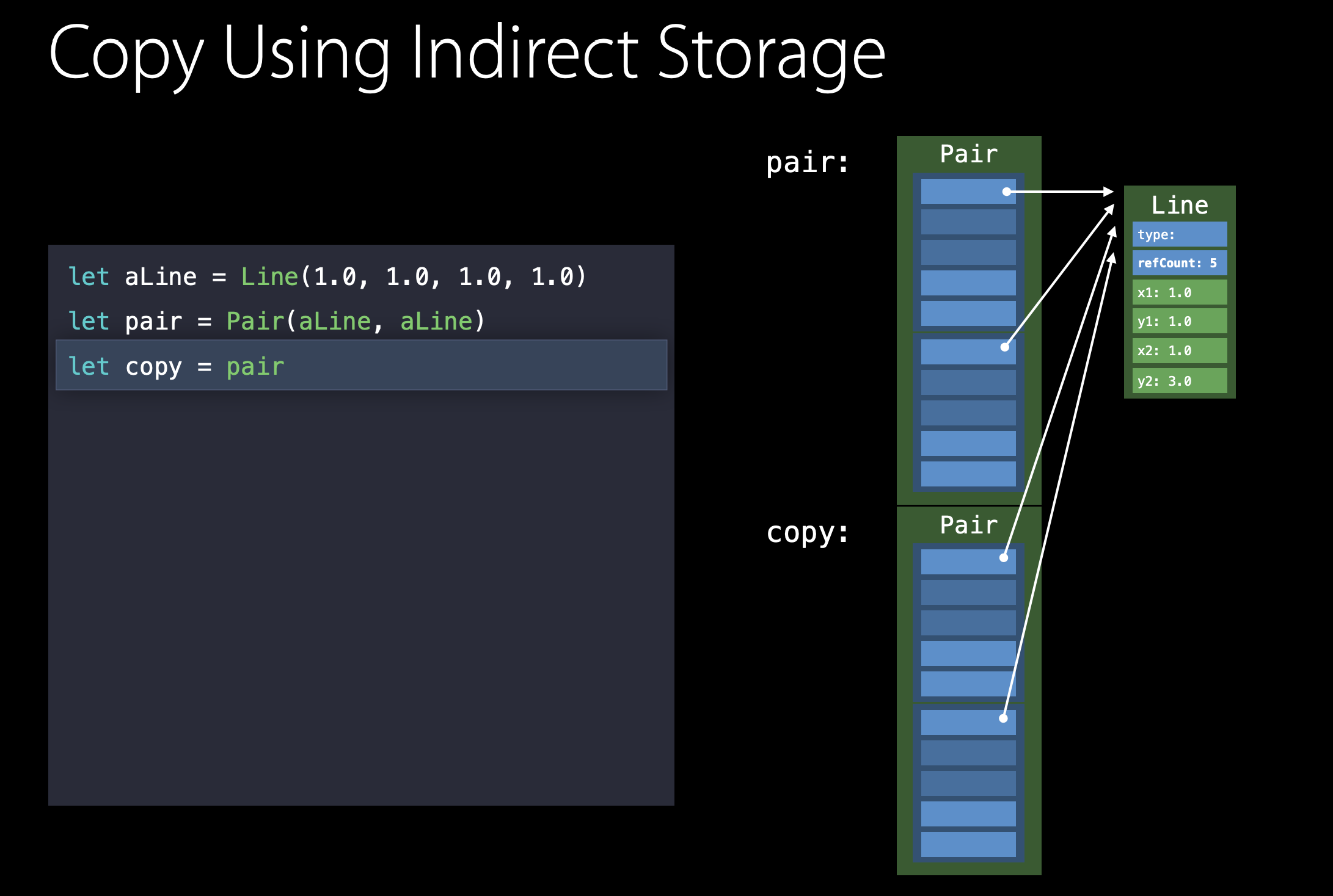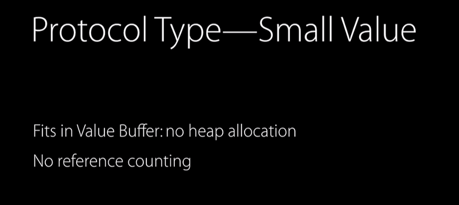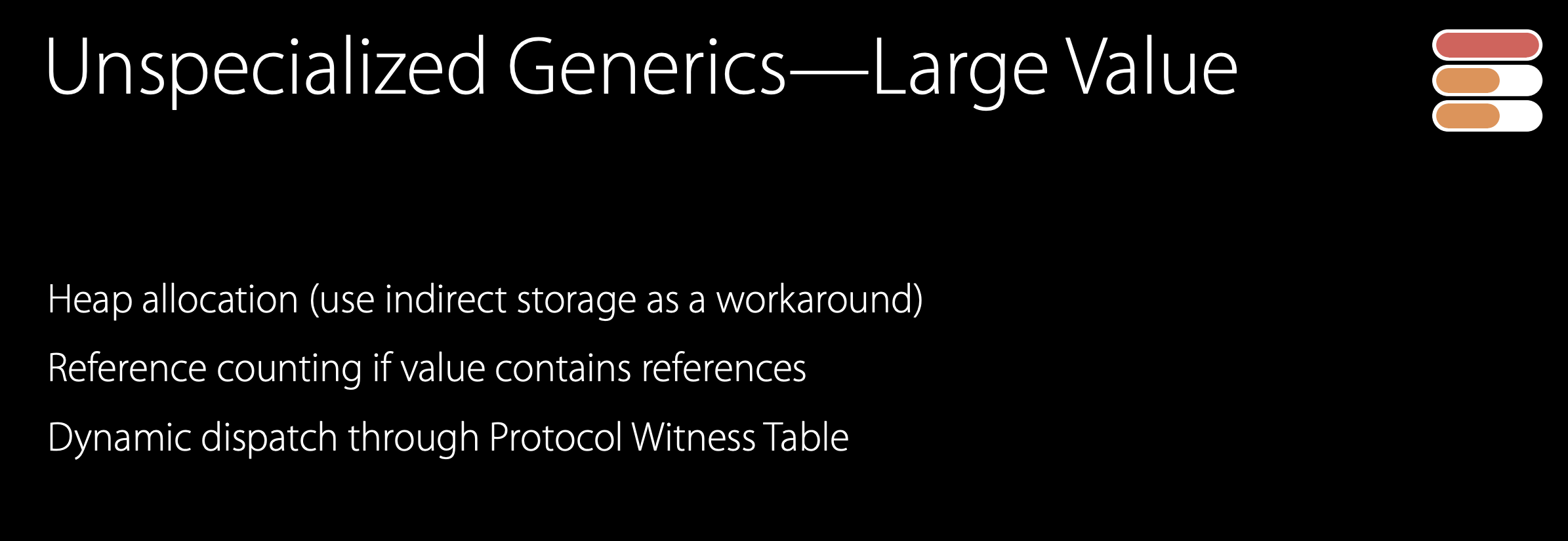 - 큰 값에 참조가 포함된 경우 reference counting이 생기고, dynamic dispatch의 힘을 얻는다. 즉, 코드 전체에서 하나의 구현을 공유할 수 있다