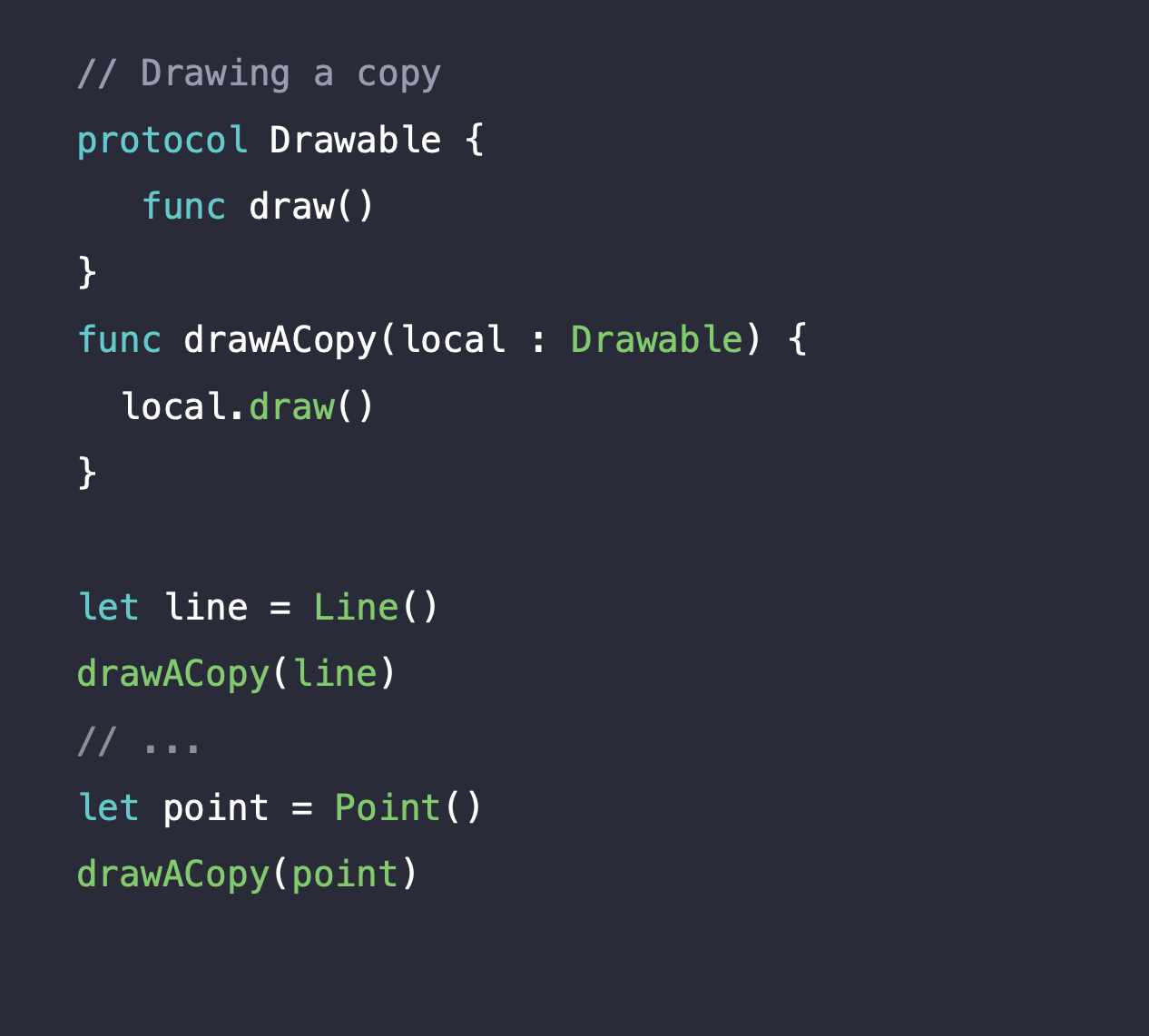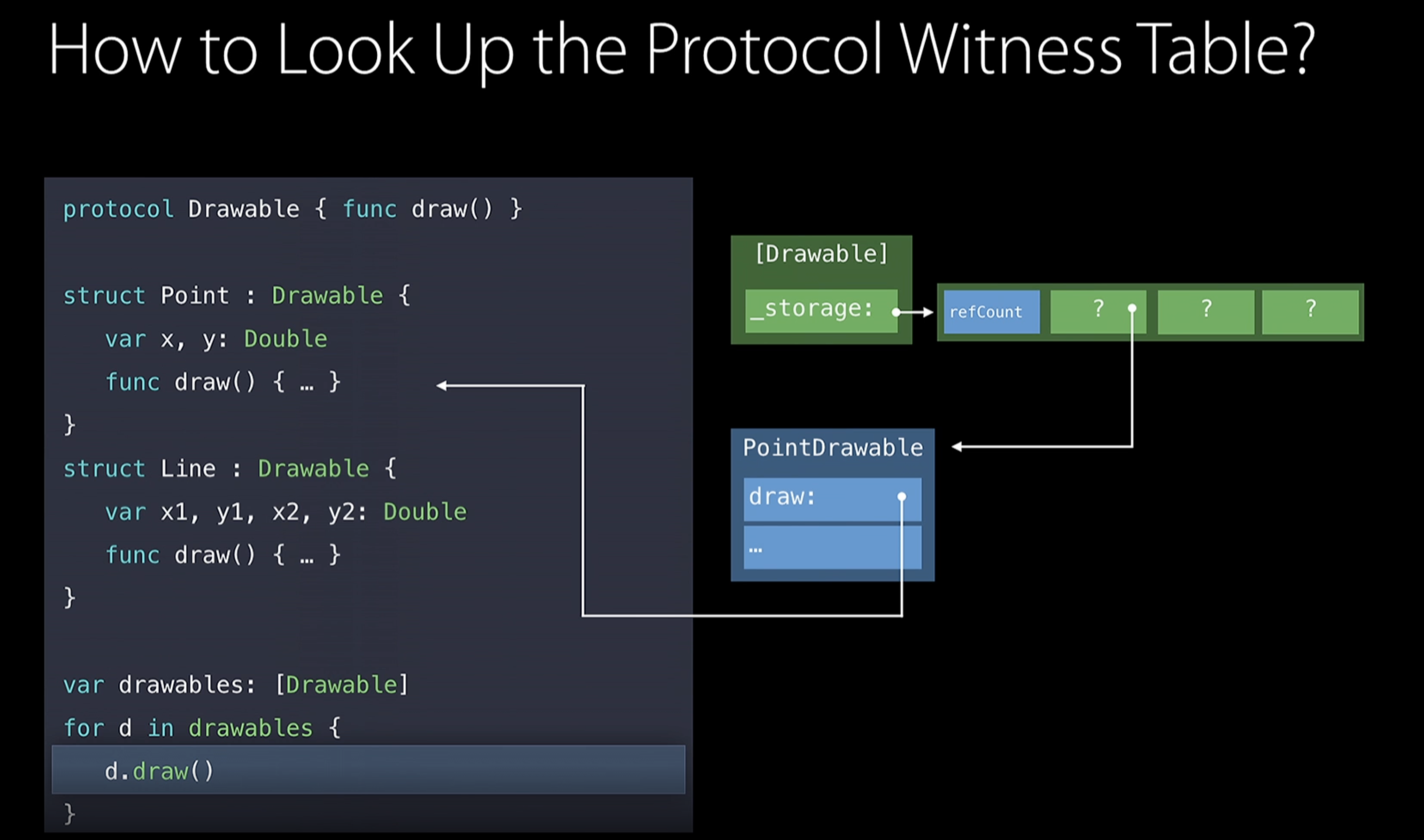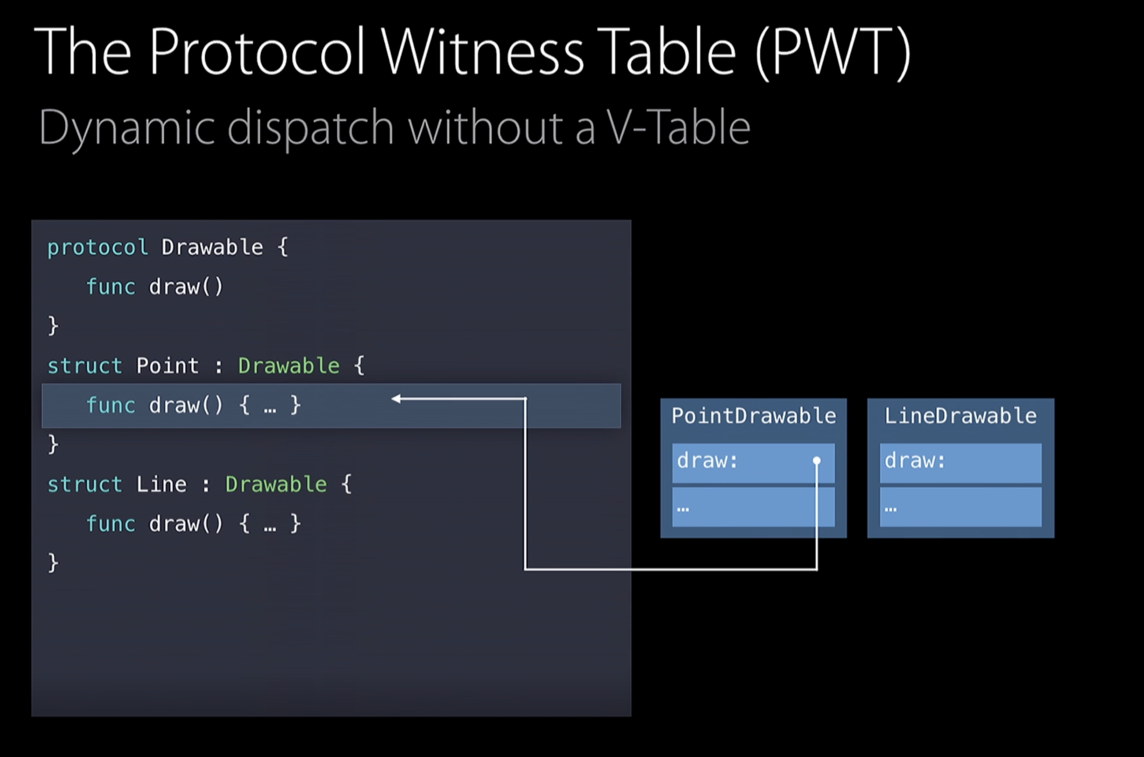 draw메서드를 사용할 때면,protocol witness table을 사용하여, table에서 고정된 오프셋에 있는draw메서드를 찾아서 해당 구현으로 점프한다.