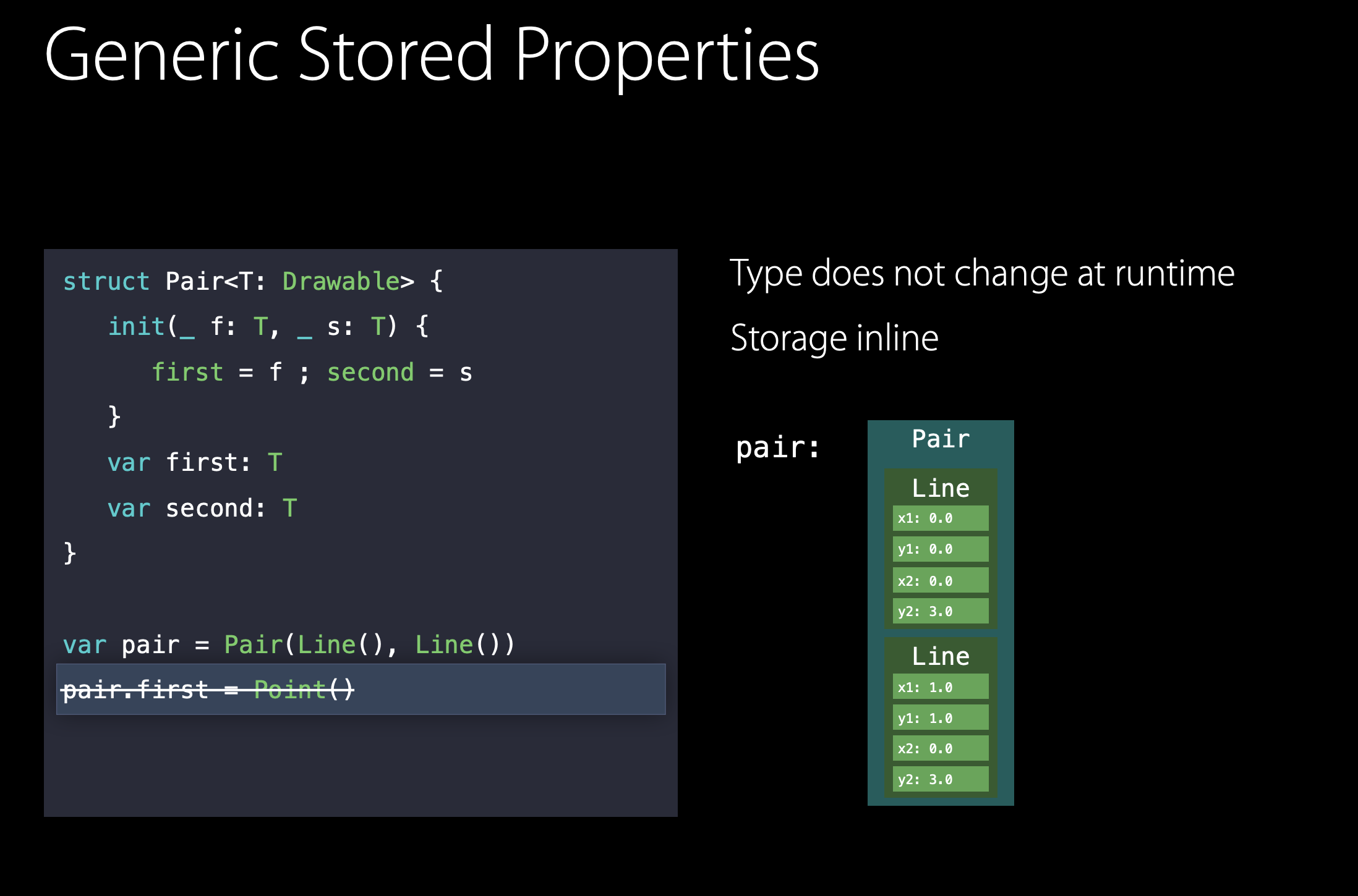 value type인 struct Line과 struct Point는 V-Table dispatch에 필요한 공통 상속 관계(common inheritance relationship)를 공유하지 않는다.