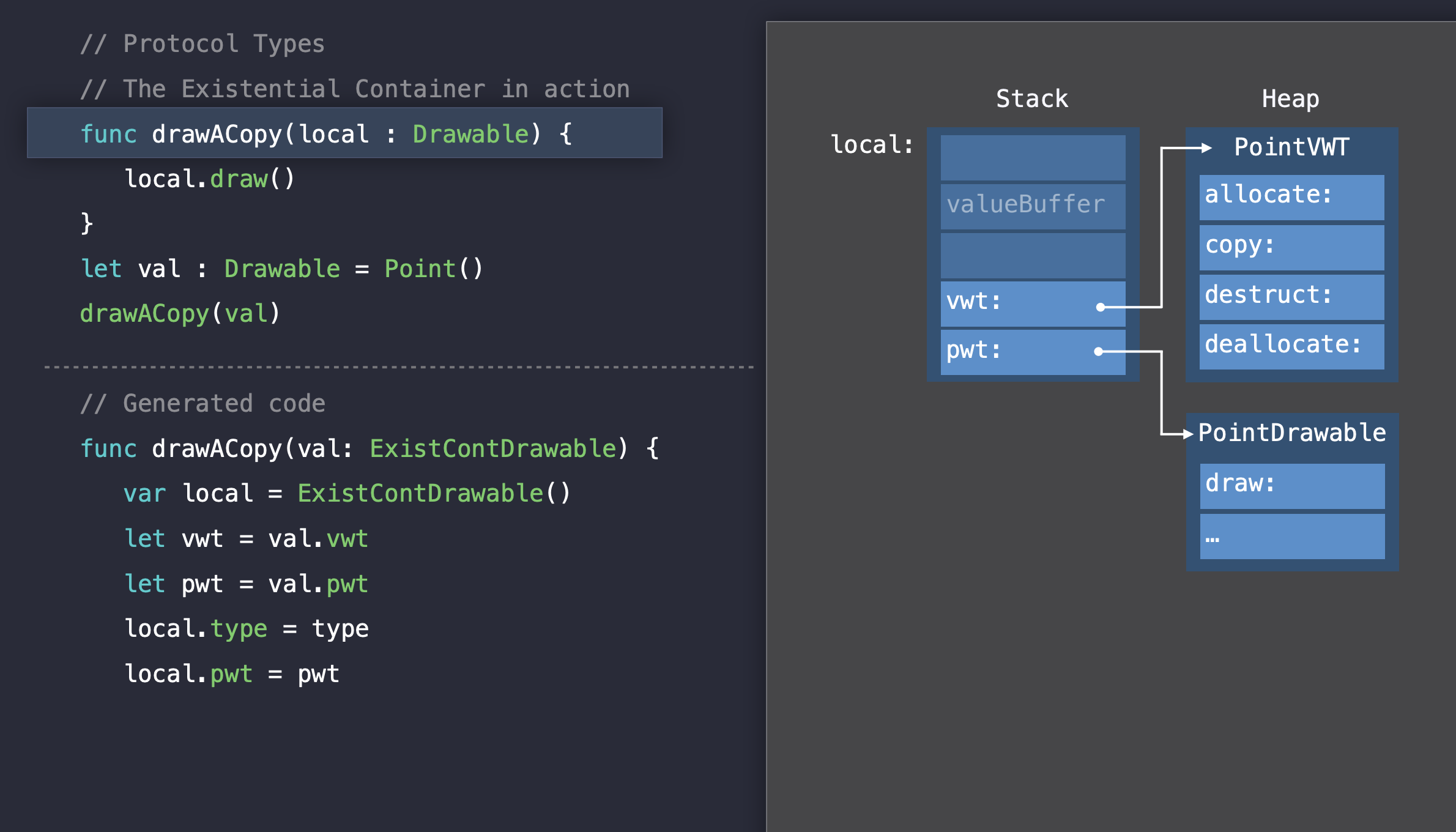 - protocol 타입의 지역 변수의 생명주기의 시작에는, Swift가 테이블 안에 allocate function을 호출한다.