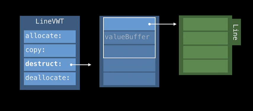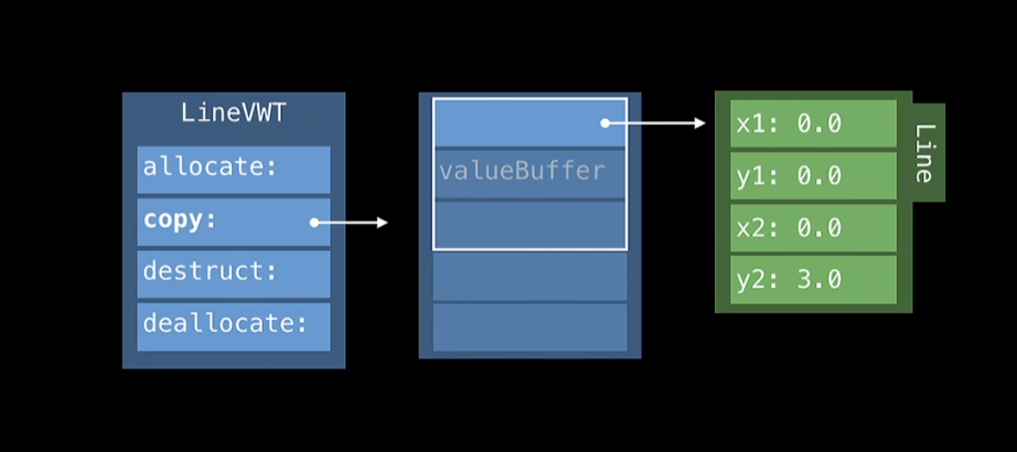 Line이 있으므로 우리의Value Witness Table의 복사 항목(copy entry)은 올바른 작업을 수행하고 힙(stack아닌가??? 왜 힙이라고 말했지?)에 할당된valueBuffer에 복사합니다.