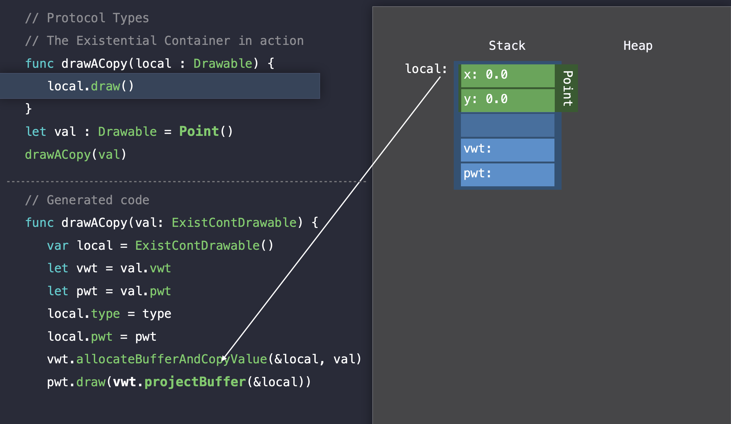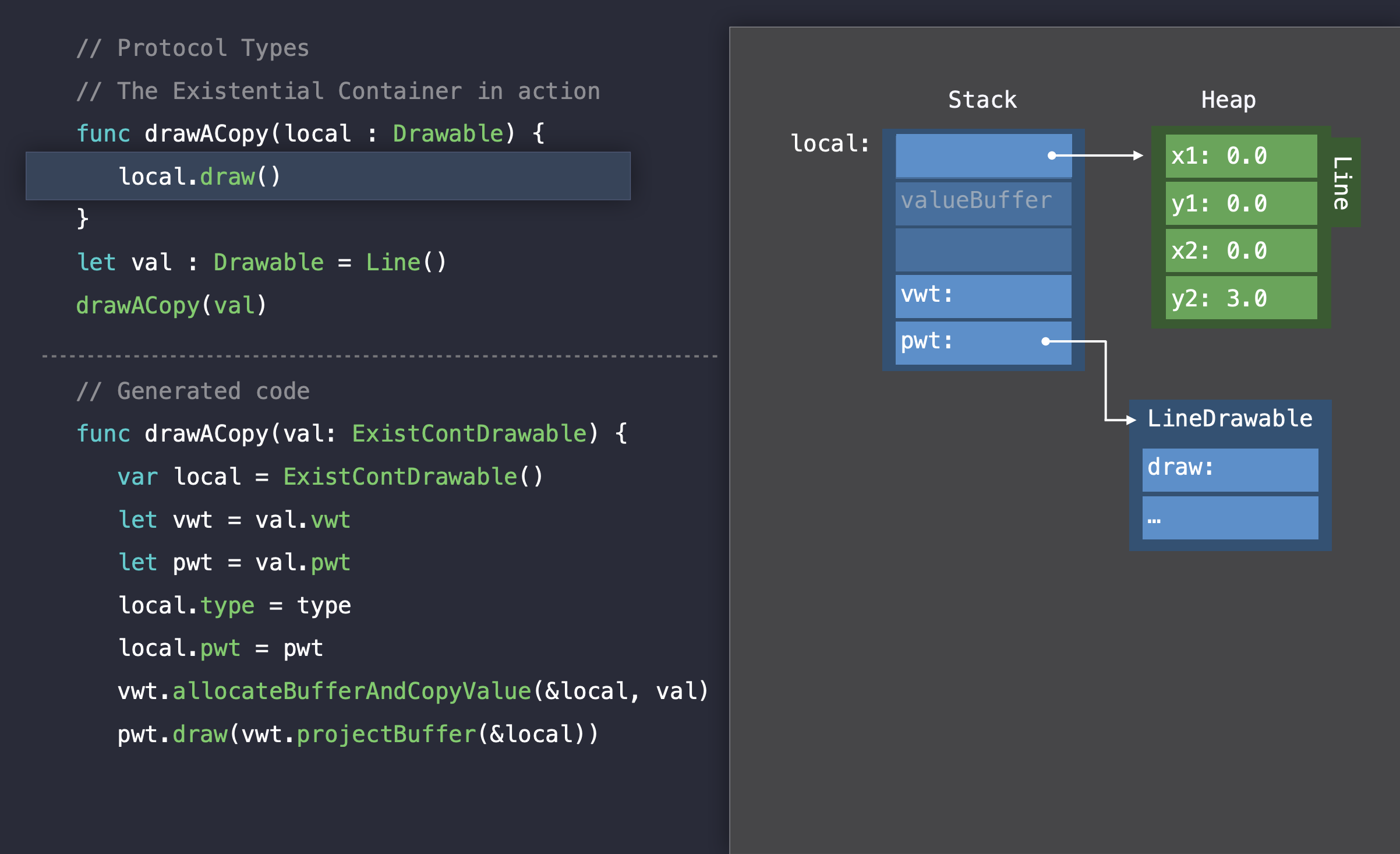 draw메소드가 실행되고 Swift는Existential Container의 필드에서Protocol Witness Table을 조회하고, 그 테이블의 고정 offset에서draw메소드를 조회하고, 구현으로 점프한다.
