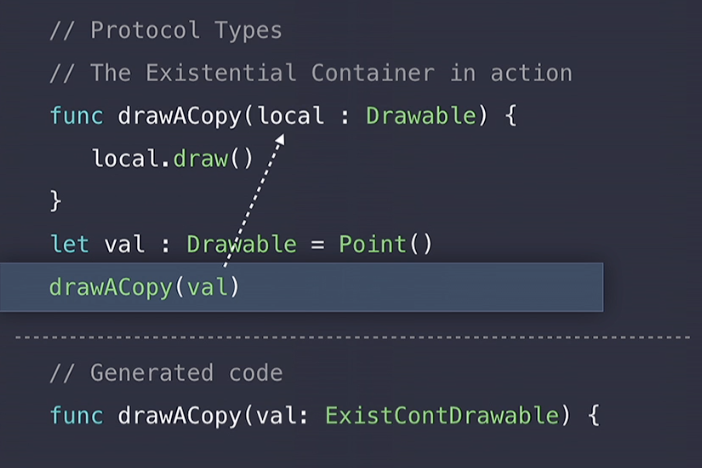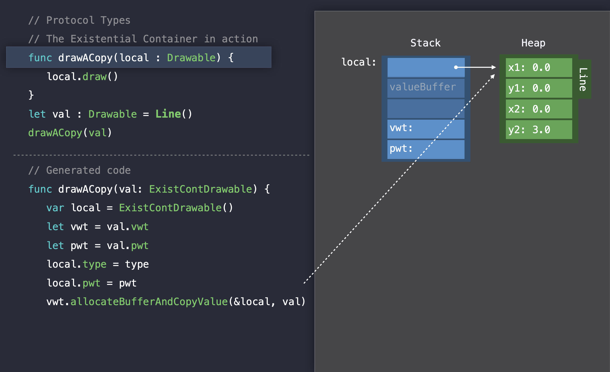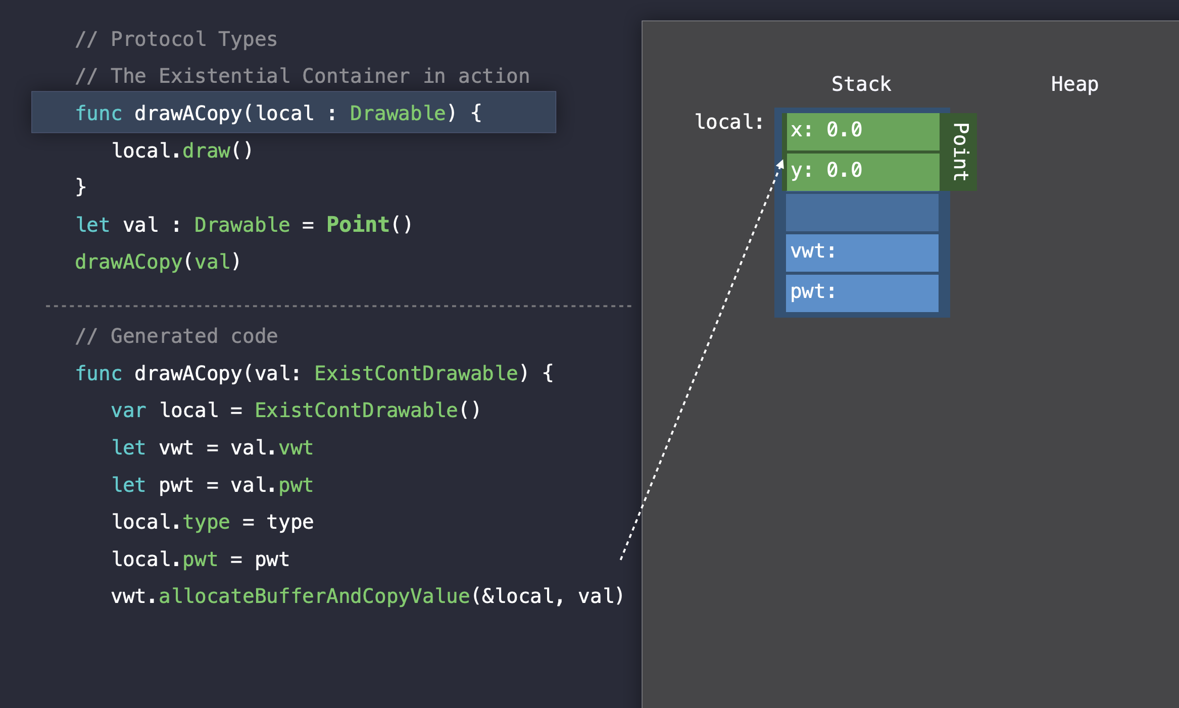 지금까지 Swift가 프로토콜 유형의 value를 관리하는 방법을 살펴봤다. Existential Container가 작동하는 것을 보기 위해 예시를 살펴보자.