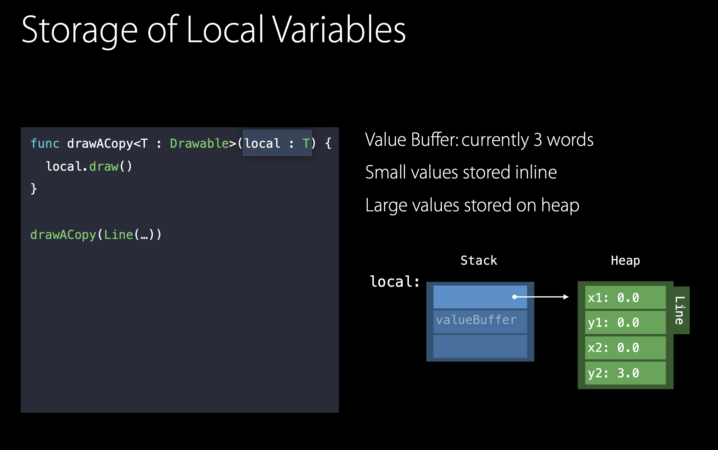 - 함수 실행 도중에, 파라미터를 위한 지역 변수를 생성할 때, Swift는 Value Witness Table을 사용해서 잠재적으로 필요한 모든 버퍼를 힙에 할당하고 할당 소스(source of the assignment)에서 대상으로 복사한다.