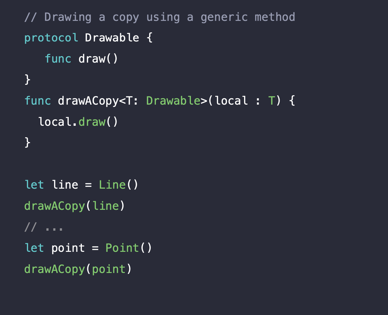 - 함수가 실행될 때, Swift는 generic 타입 T를 call side에서 호출할 때의 타입과 binding한다. 이 예제에서는 Point와 바인딩한다.