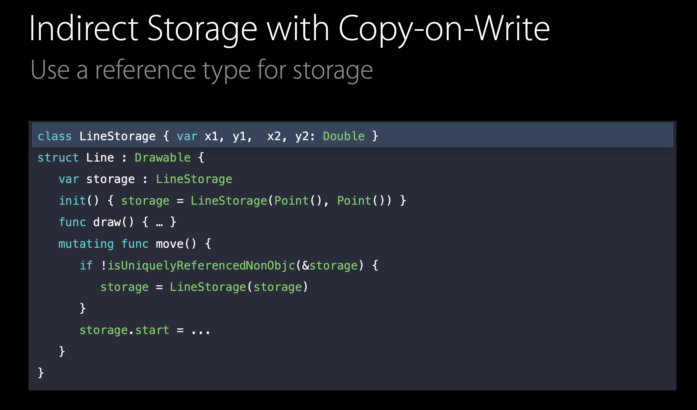 - 생성된 코드에 대한 의미는 Swift가 enclosing 유형의 인라인 스토리지를 할당할 수 있다는 것이다.