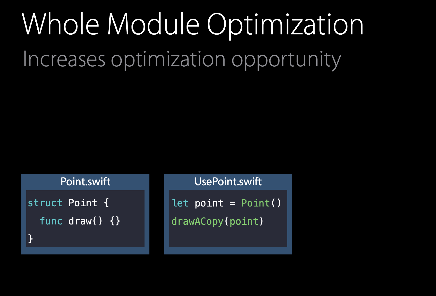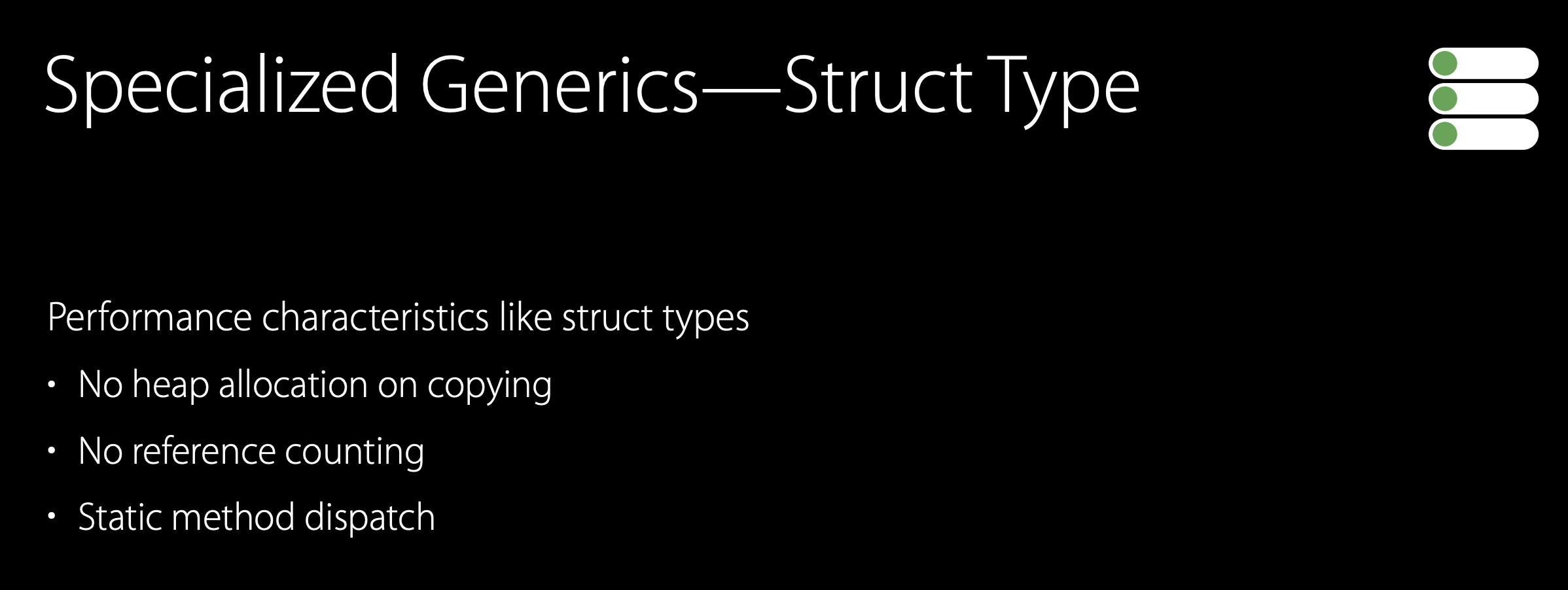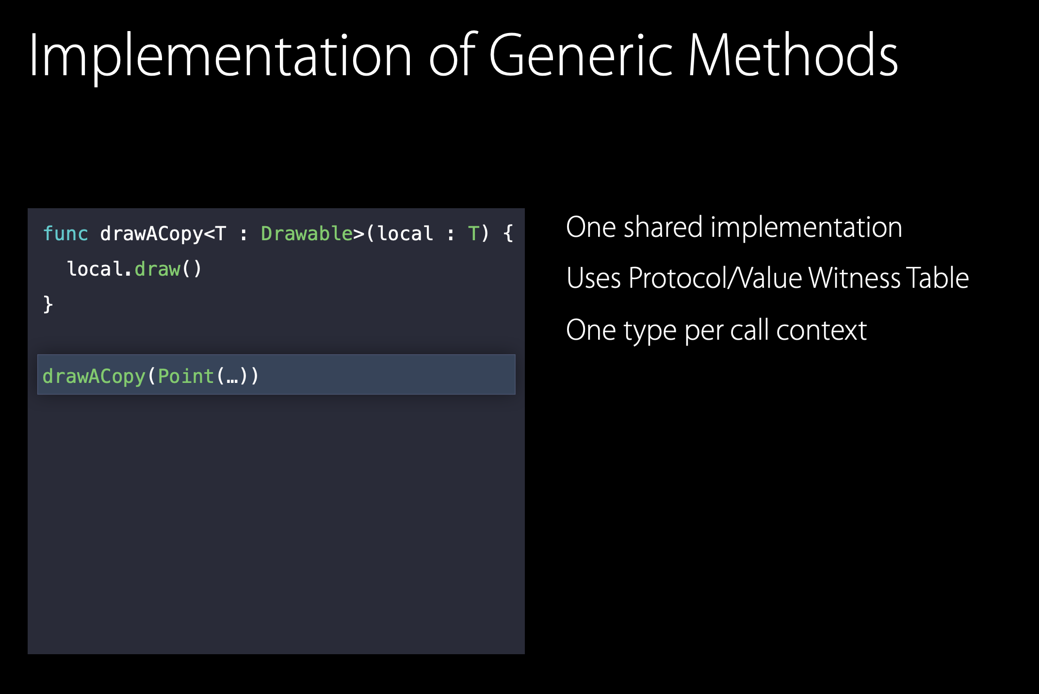 - static type의 정보는 컴파일러가 공격적으로 최적화를 할 수 있게끔 해주고, Swift는 잠재적으로 코드 사이즈를 줄일 수 있다 ! (앞서 1부에서 봤던 컴파일러 최적화처럼, call stack대신 그냥 구현한줄로 대체해버리는…inlining이라고 불리는 기술)