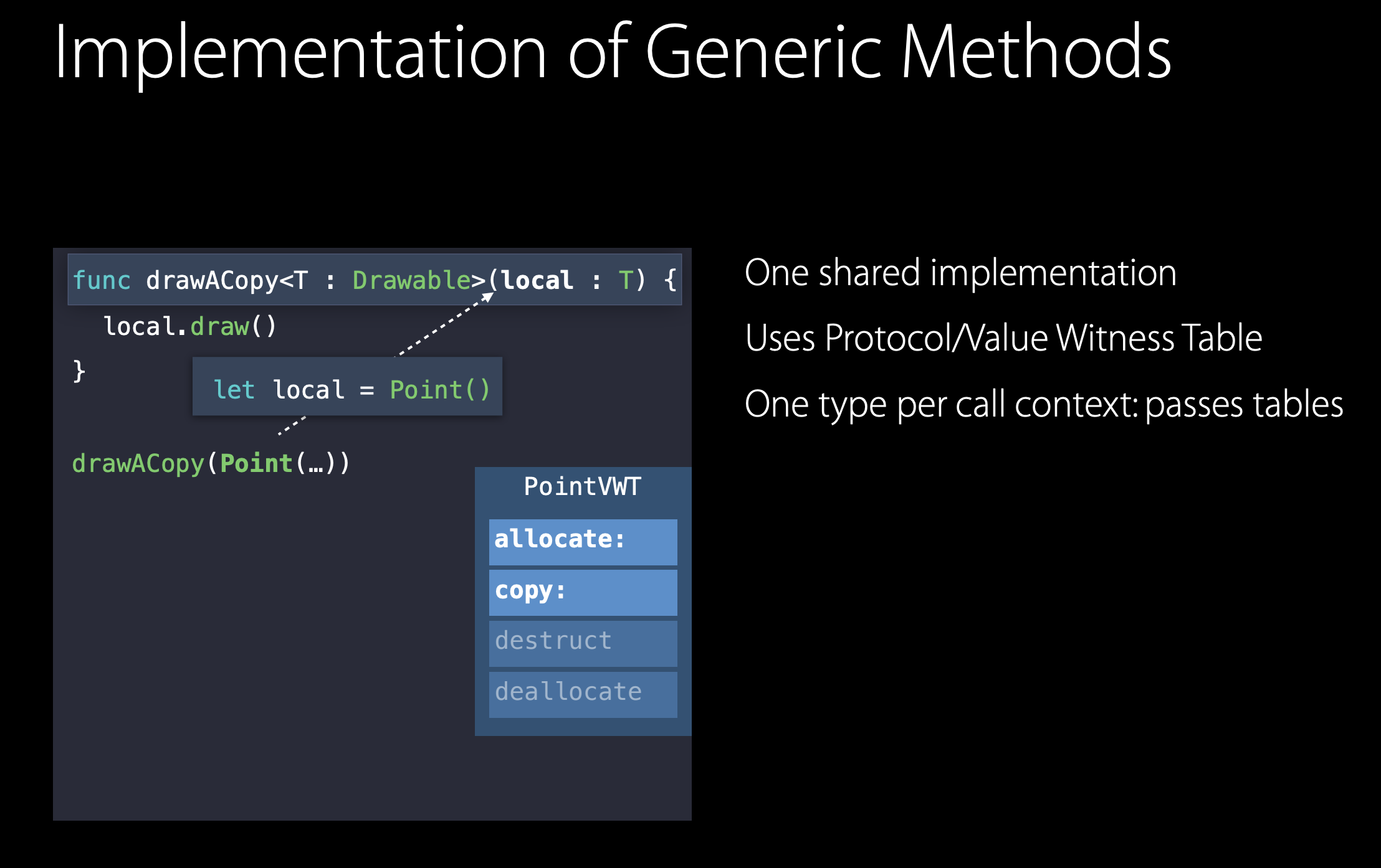 witness table을 사용하여 모든 잠재적 call site에서 하나의 구현을 공유한다.