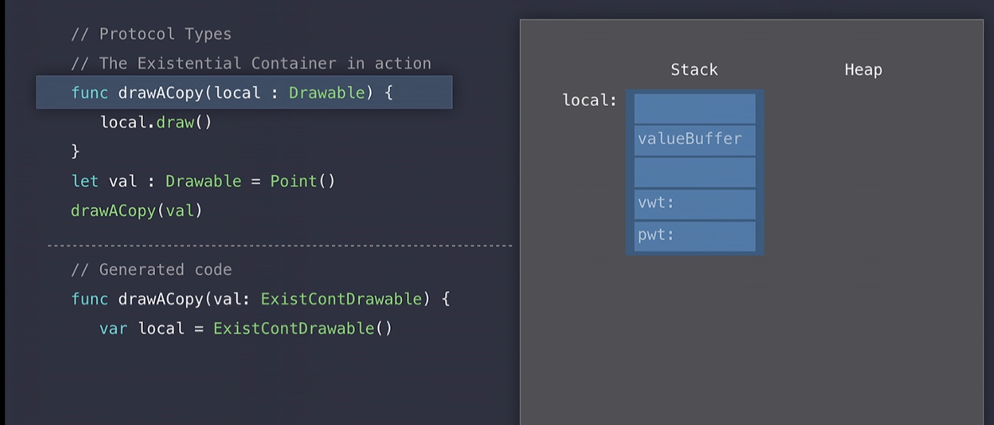 - 여기에는 Existential Container가 없다. 그렇다면 어떻게 매개 변수를 위해 생성된 지역 변수에 대해 필요한 메모리를 할당할까???
