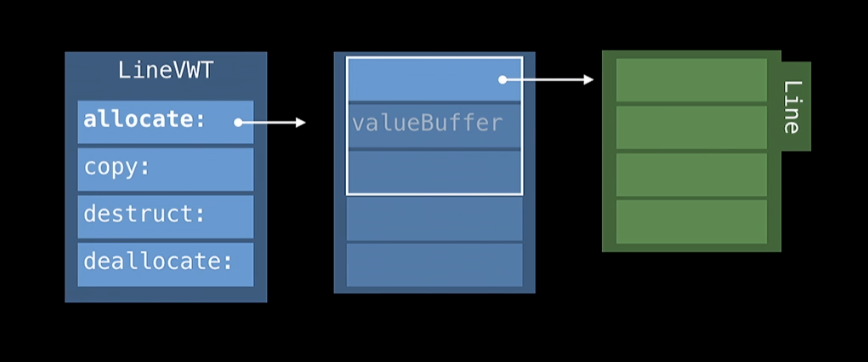 Existential Container가 가지고 있는 모습. allocate function을 통해 이 과정이 이루어졌다.