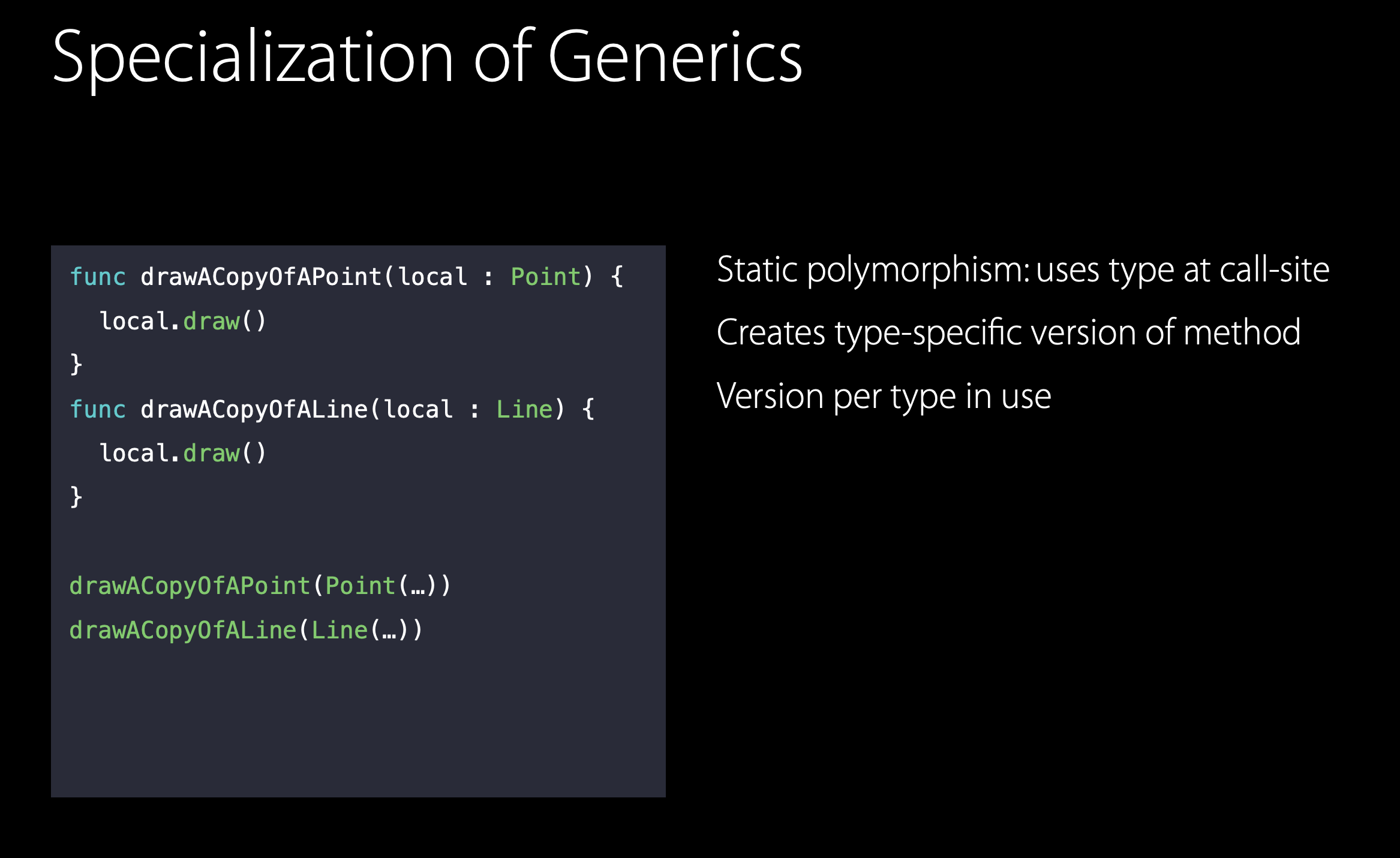 - 또한, Swift는 specialization 중에 사용되는 Type과 함수 - 사용 가능한 generic function 자체의 정의를 모두 가질 필요가 있다.