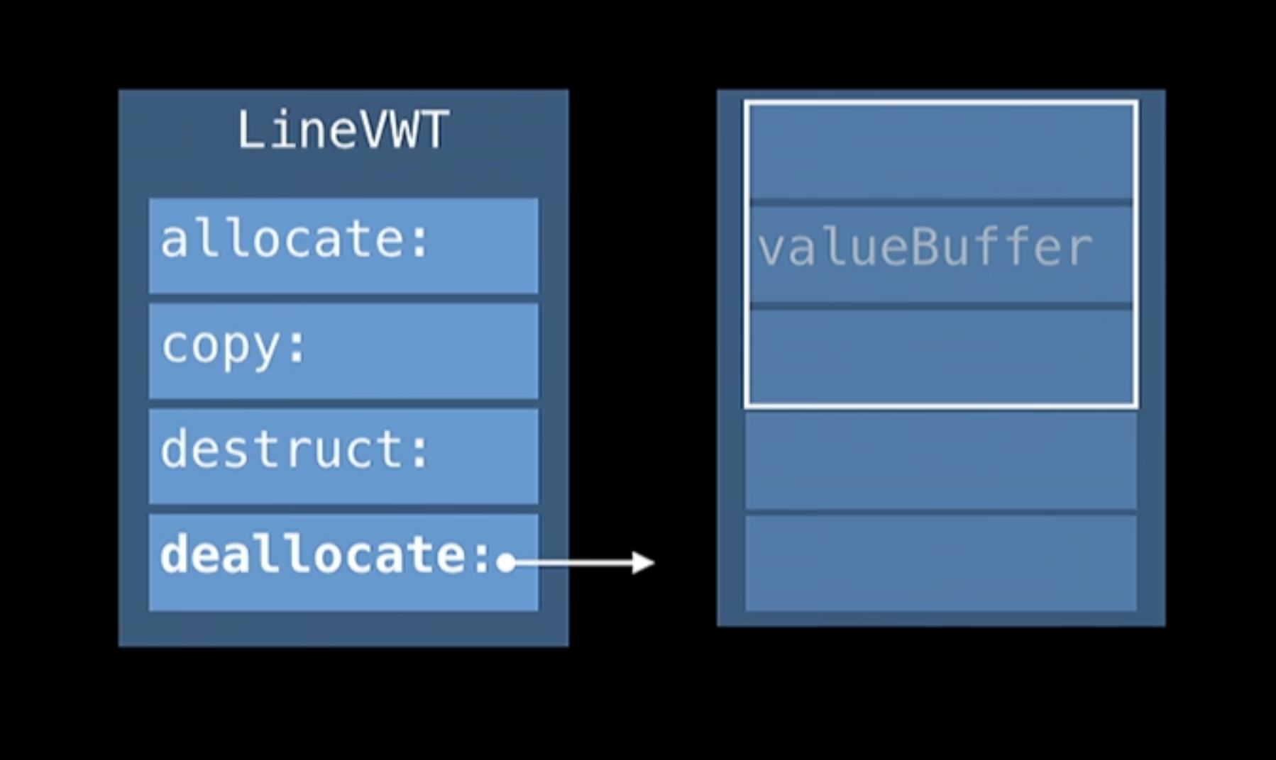 이 경우에도 table based mechanism이 사용되는데, 이것을 우리는 Value Witness Table(VWT)라고 부른다.