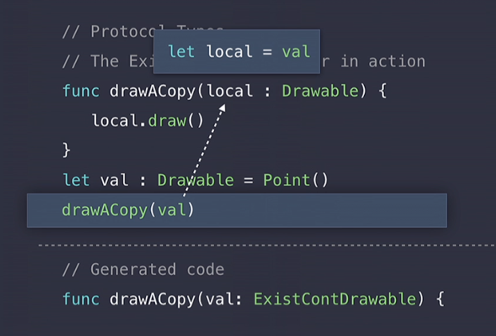 - 여기에는 Existential Container가 없다. 그렇다면 어떻게 매개 변수를 위해 생성된 지역 변수에 대해 필요한 메모리를 할당할까???
