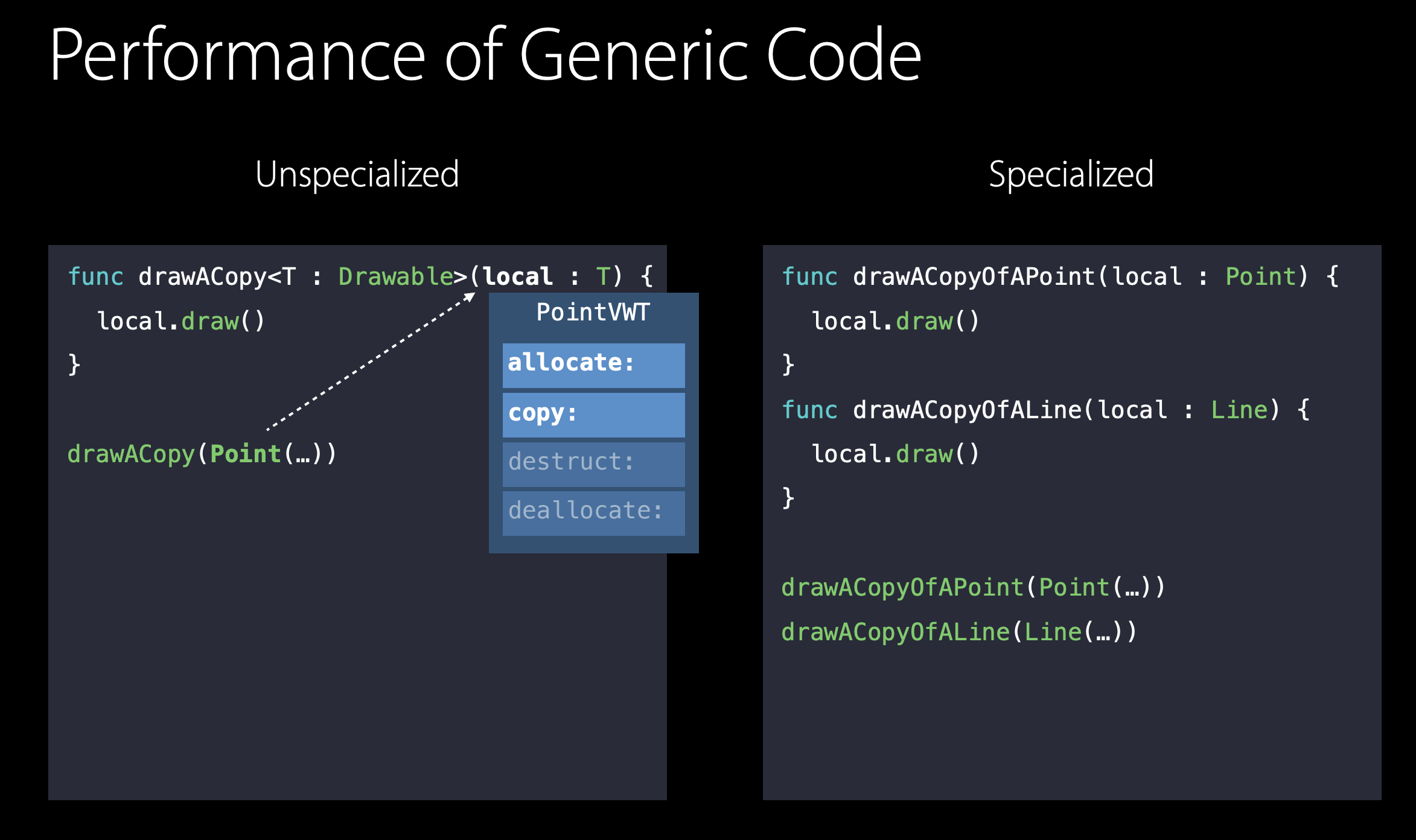 - 또한, Swift는 specialization 중에 사용되는 Type과 함수 - 사용 가능한 generic function 자체의 정의를 모두 가질 필요가 있다.