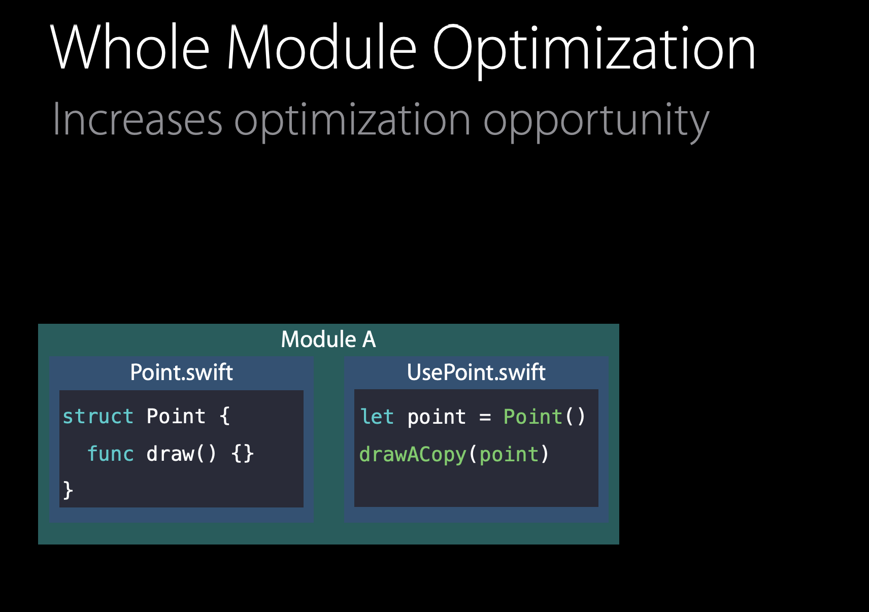 - static type의 정보는 컴파일러가 공격적으로 최적화를 할 수 있게끔 해주고, Swift는 잠재적으로 코드 사이즈를 줄일 수 있다 ! (앞서 1부에서 봤던 컴파일러 최적화처럼, call stack대신 그냥 구현한줄로 대체해버리는…inlining이라고 불리는 기술)
