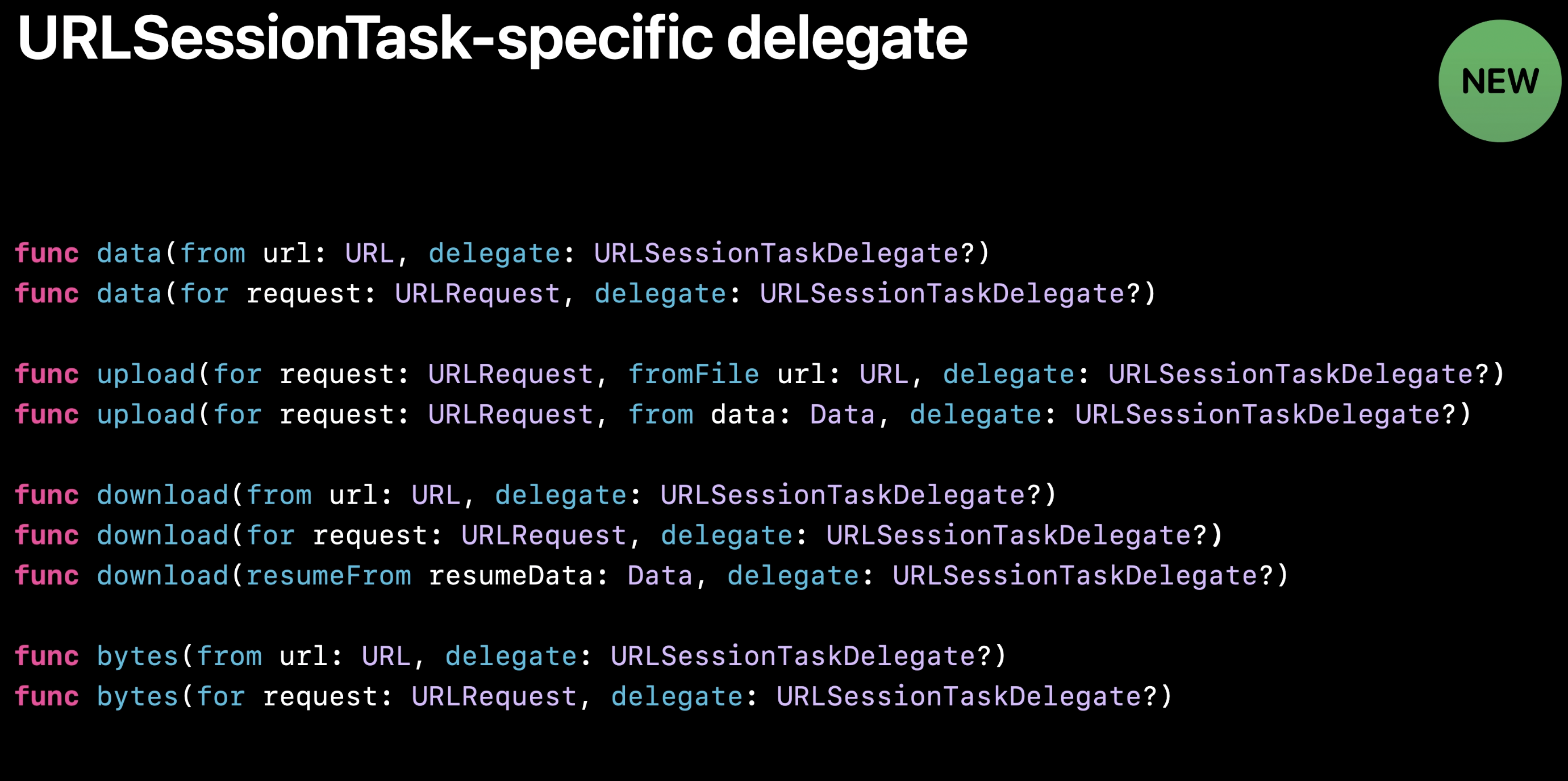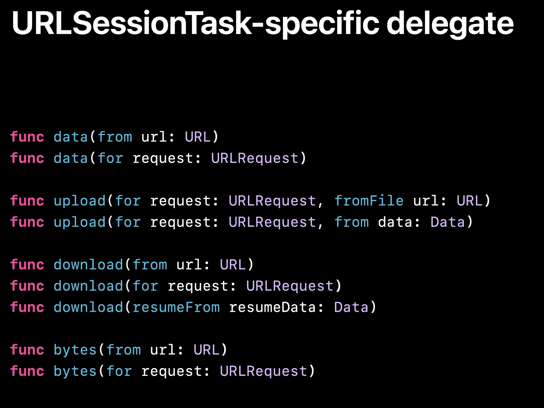 - 여기서 새로운 점은 delegate를 사용하여 URLSession task의 인스턴스에 특정한 이벤트를 처리할 수 있다는 것인데, 이는 delegate 메서드 내부의 로직이 특정 URLSession task에만 적용되고 다른 task에는 적용되지 않을 때 유용합니다.