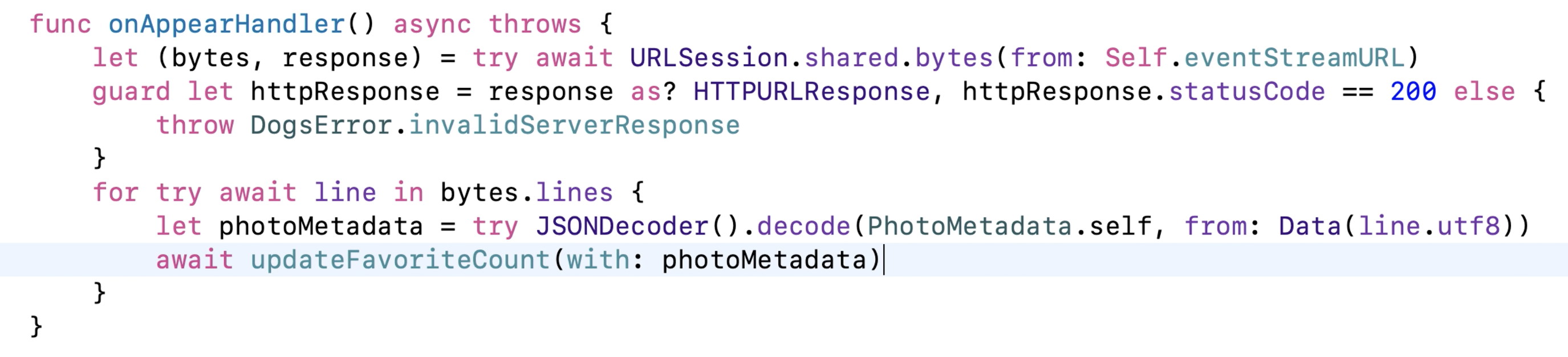 - 응답의 각 줄을 JSON 데이터로 파싱하기 위해 AsyncBytes에서 lines 메서드를 사용할 수 있습니다.