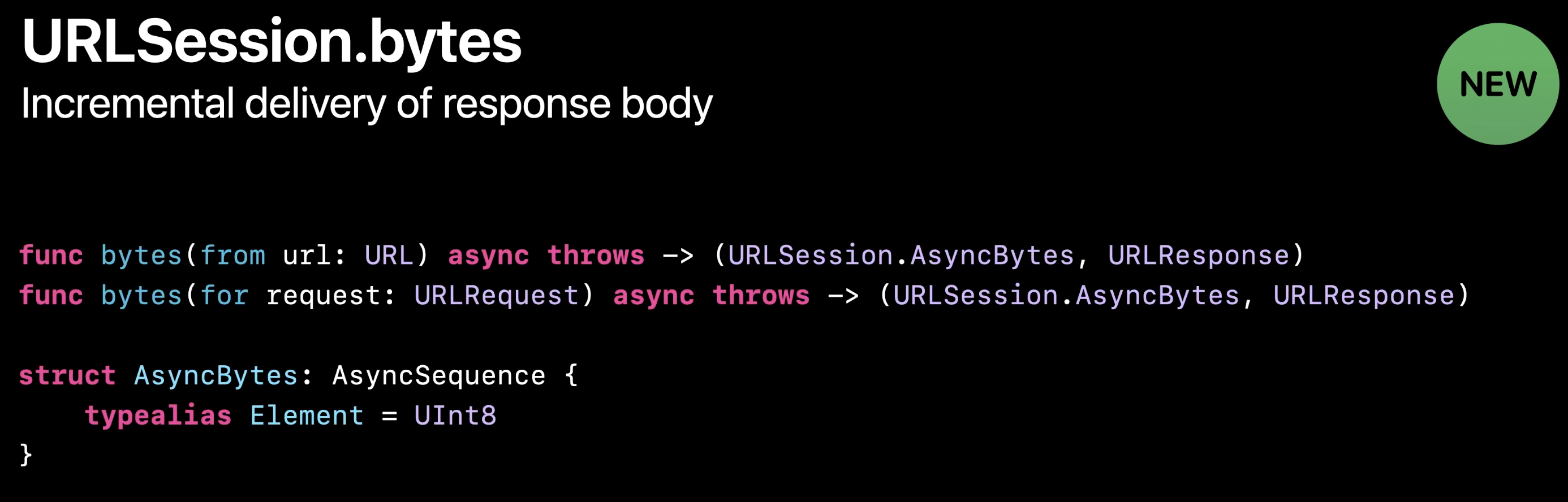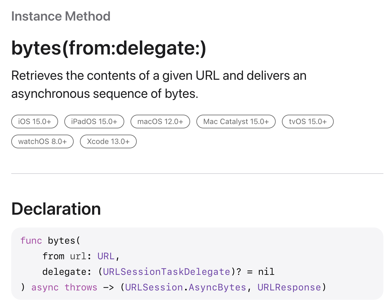 - bytes의 반환값은 위에서 살펴봤듯이 URLSession.AsyncBytes. 이것이 점진적으로 response body를 받을 수 있게끔 도와줍니다.