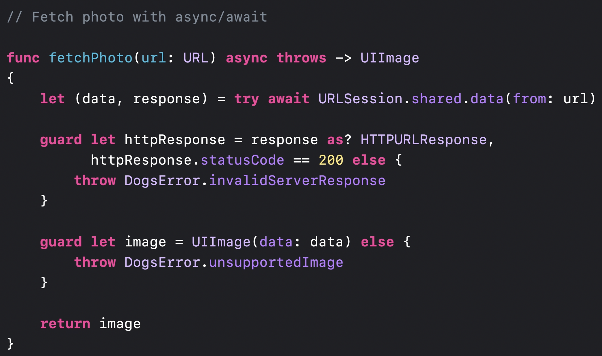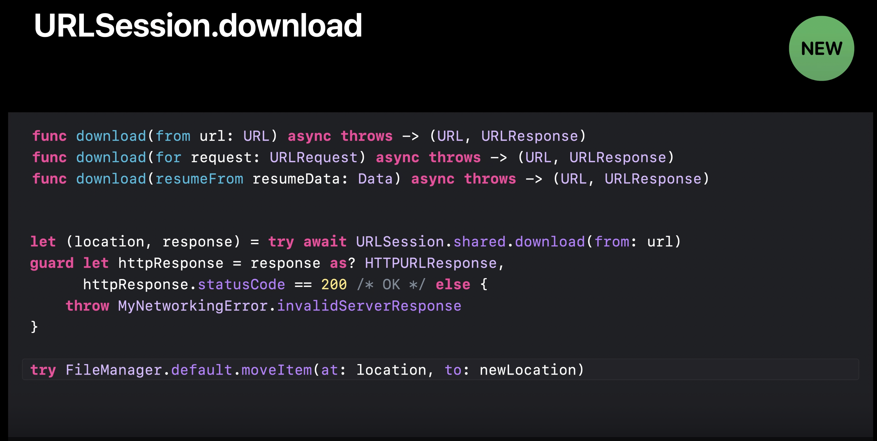 이제 control flow도 Linear해졌고 같은 execution context를 가질 수 있게 되었을 뿐만 아니라 훨씬 의도가 잘보이고 깔끔한 코드가 되었네요. 간단한 애플의 API를 completion handler에서 async/await, task를 활용해서 리팩토링까지 해보았는데 여러므로 장점이 훨씬 많아보이네요 !