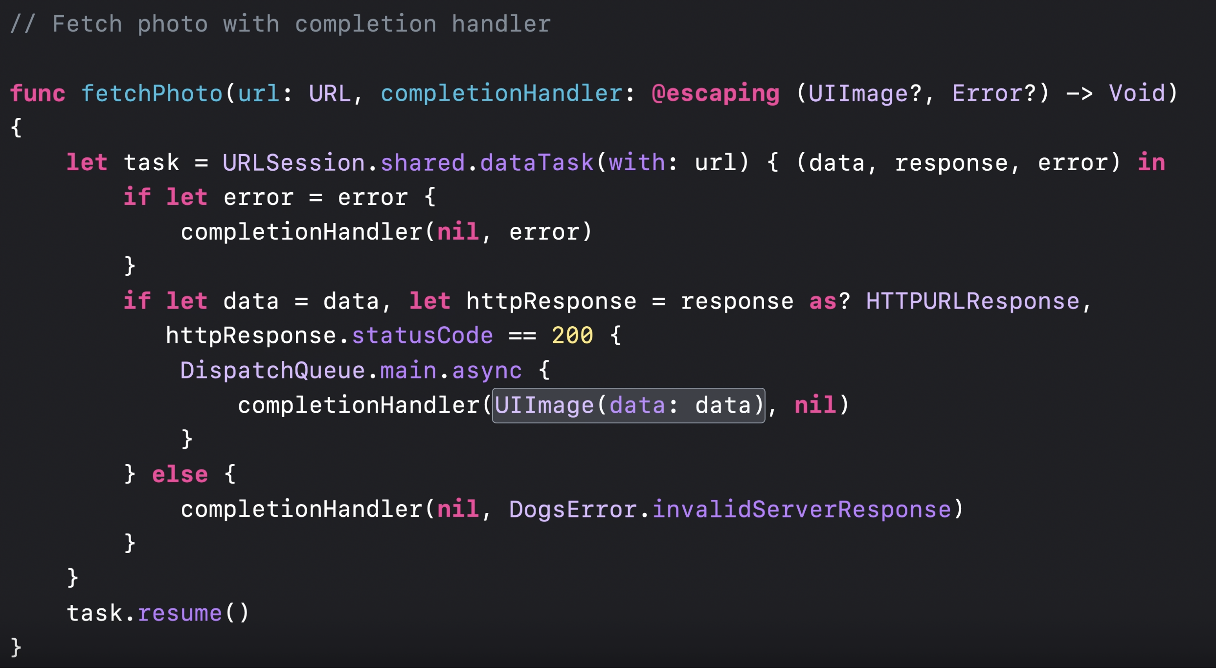 - task가 끝나면 completion handler로 들어와서, response를 확인하고 이미지를 만든다.