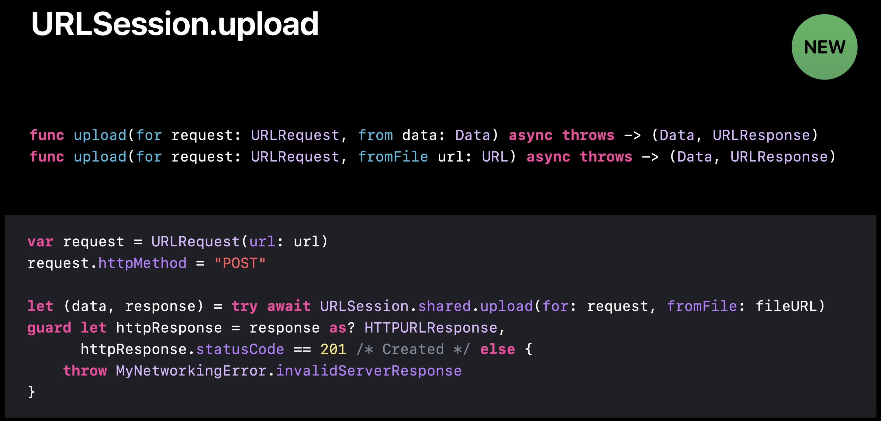 - 여기서 새로운 점은 delegate를 사용하여 URLSession task의 인스턴스에 특정한 이벤트를 처리할 수 있다는 것인데, 이는 delegate 메서드 내부의 로직이 특정 URLSession task에만 적용되고 다른 task에는 적용되지 않을 때 유용합니다.