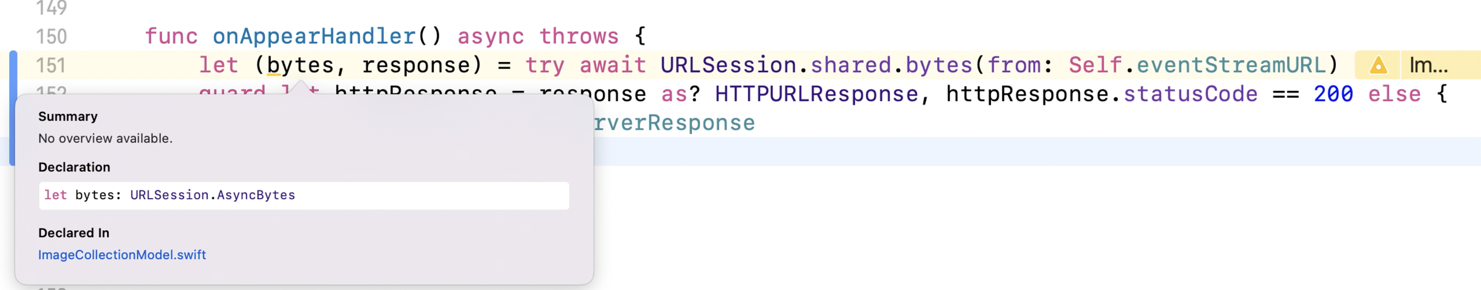 - bytes의 반환값은 위에서 살펴봤듯이 URLSession.AsyncBytes. 이것이 점진적으로 response body를 받을 수 있게끔 도와줍니다.