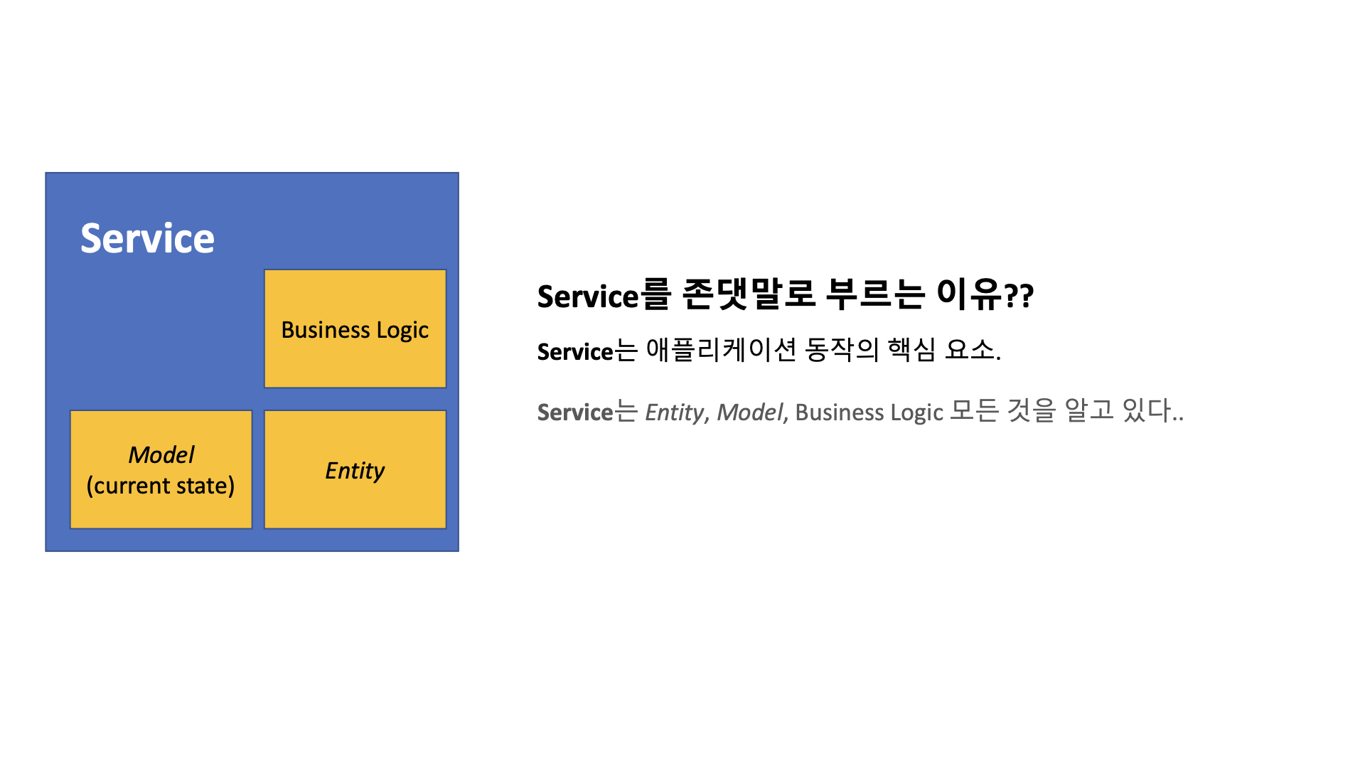 - Logic: 모든 비즈니스 로직은 이 곳에서 실행되기 때문에 로직 또한 알고 있습니다.