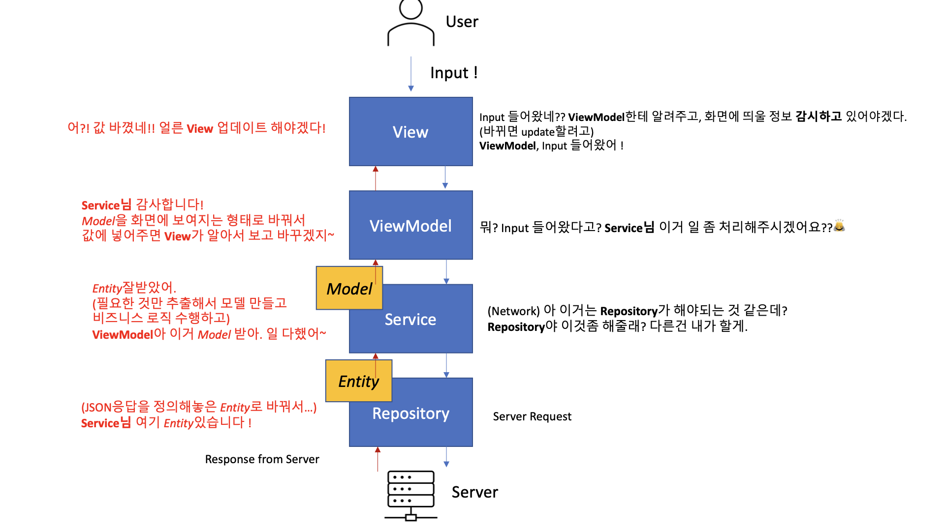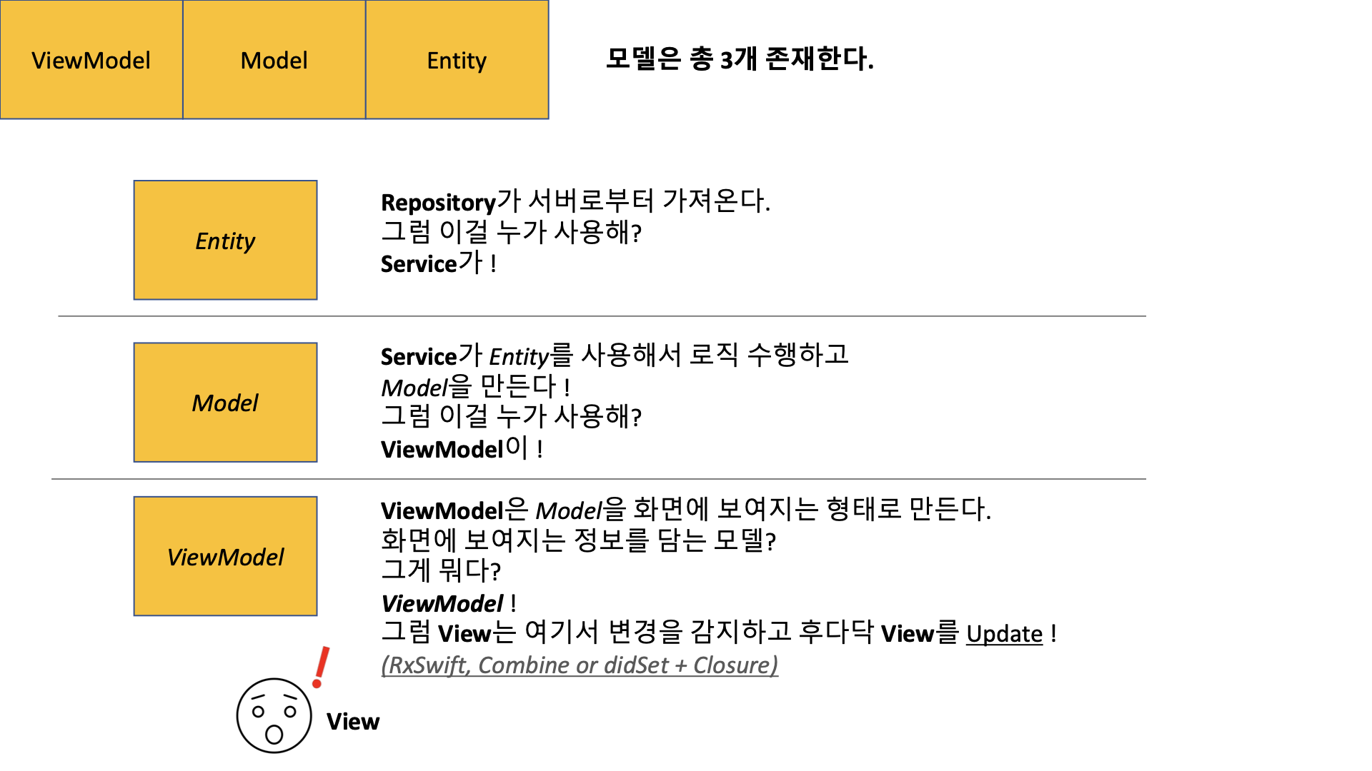 - Model: Model로 가공하여 ViewModel로 넘겨주기 때문에 Model 또한 알고 있습니다.