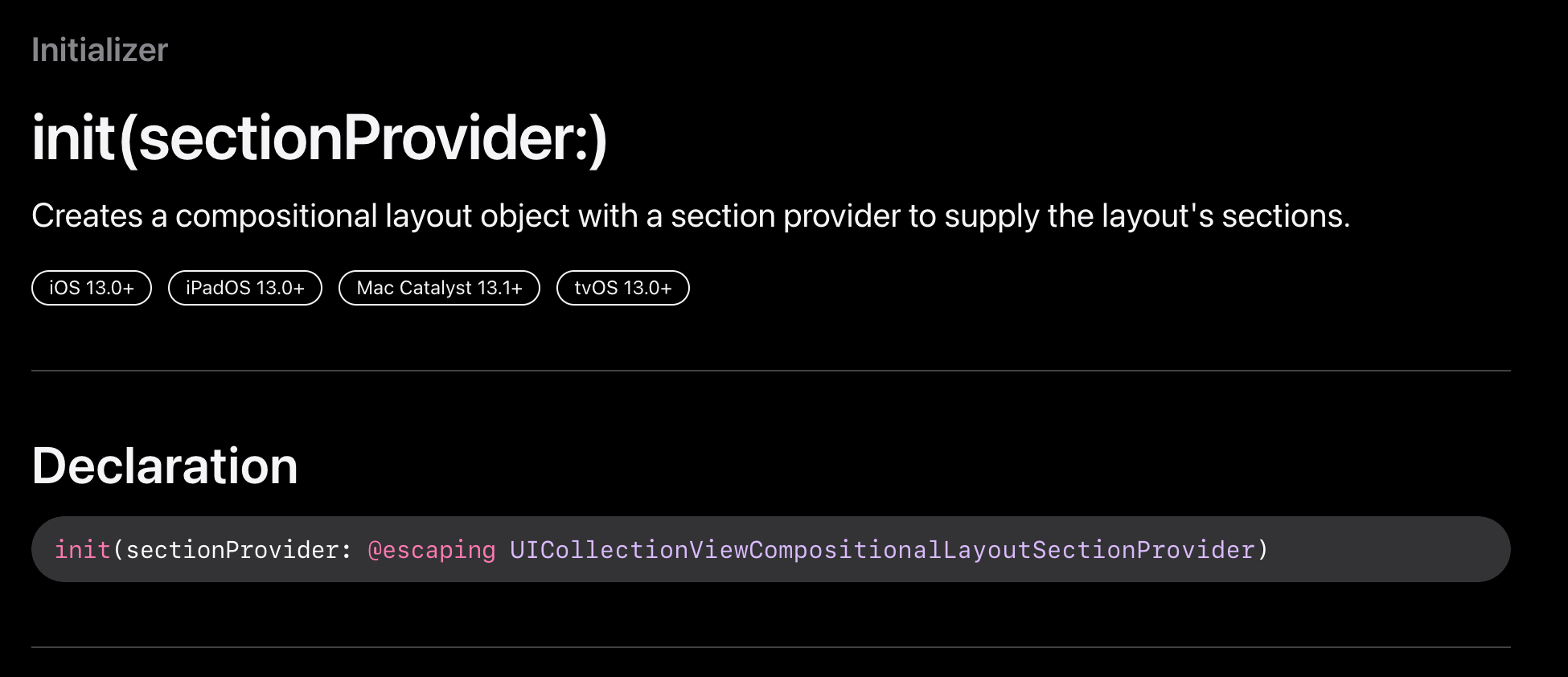 let layout = UICollectionViewCompositionalLayout { (sectionIndex: Int,