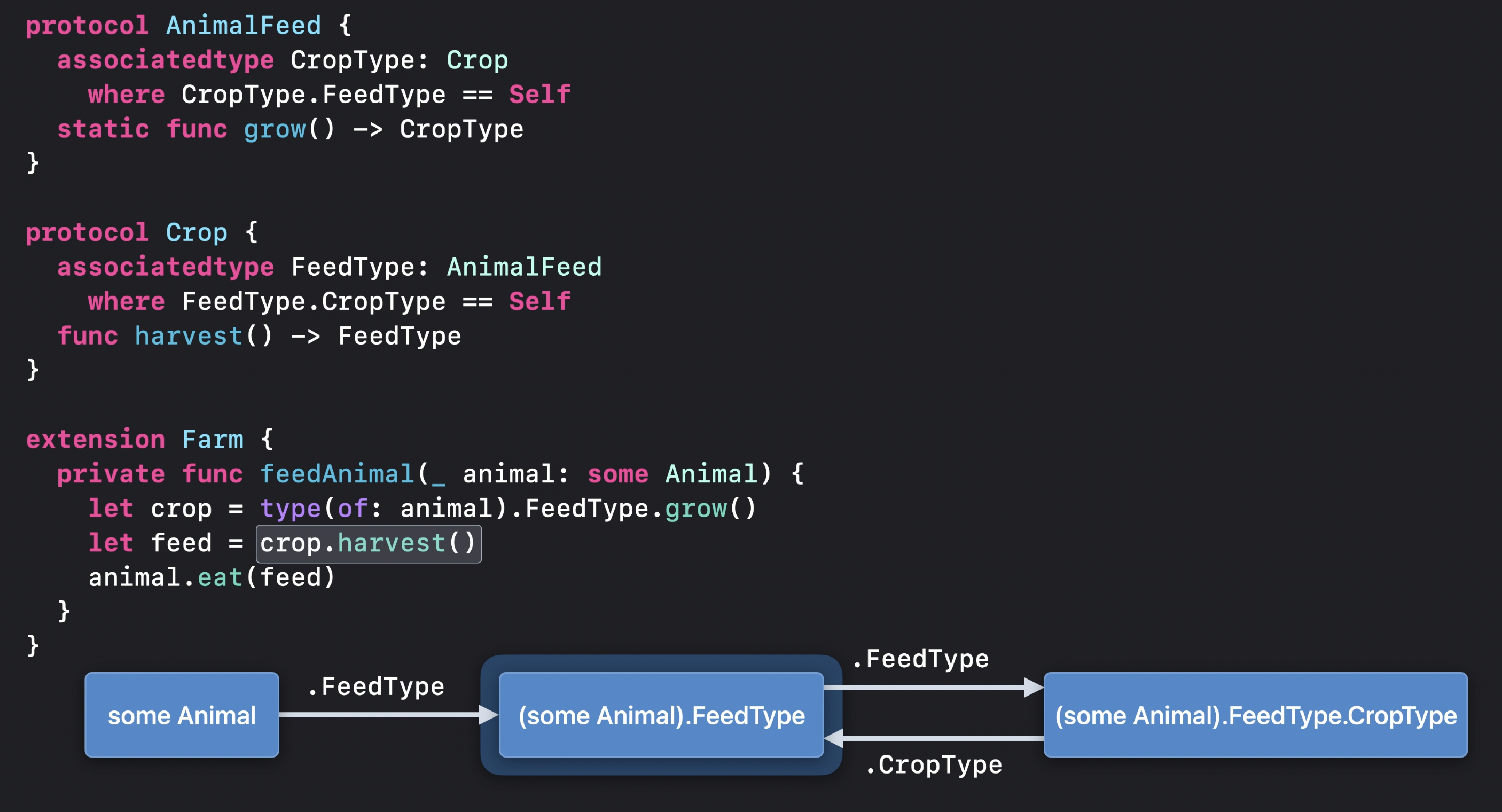 some Animal을 받는다 -> Animal에는 AnimalFeed타입의 FeedType이 있다. -> grow()호출가능 -> grow() 메서드는 AnimalFeed의 중첩 associated Crop타입의 CropType을 반환한다. -> Crop타입의 값이기 때문에 harvest()호출가능 -> harvest()는 Crop 프로토콜의 associatedtype FeedType을 반환한다. -> 이 때 base type이 (some Animal).FeedType.CropType이기 때문에 harvest를 통해 얻는 것은 (some Animal).FeedType.CropType.FeedType이 된다.