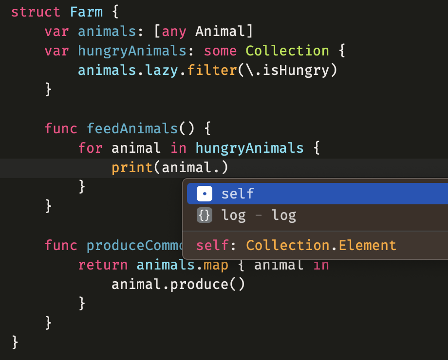 - Lazy collection은 일반 'filter' 호출로 반환되는 배열과 동일한 요소를 갖지만 임시 할당을 피한다. 그러나 이제 'hungryAnimals' 프로퍼티의 유형은 다소 복잡한 concrete type인 'LazyFilterSequence of any Animal의 배열'로 선언해야한다.
