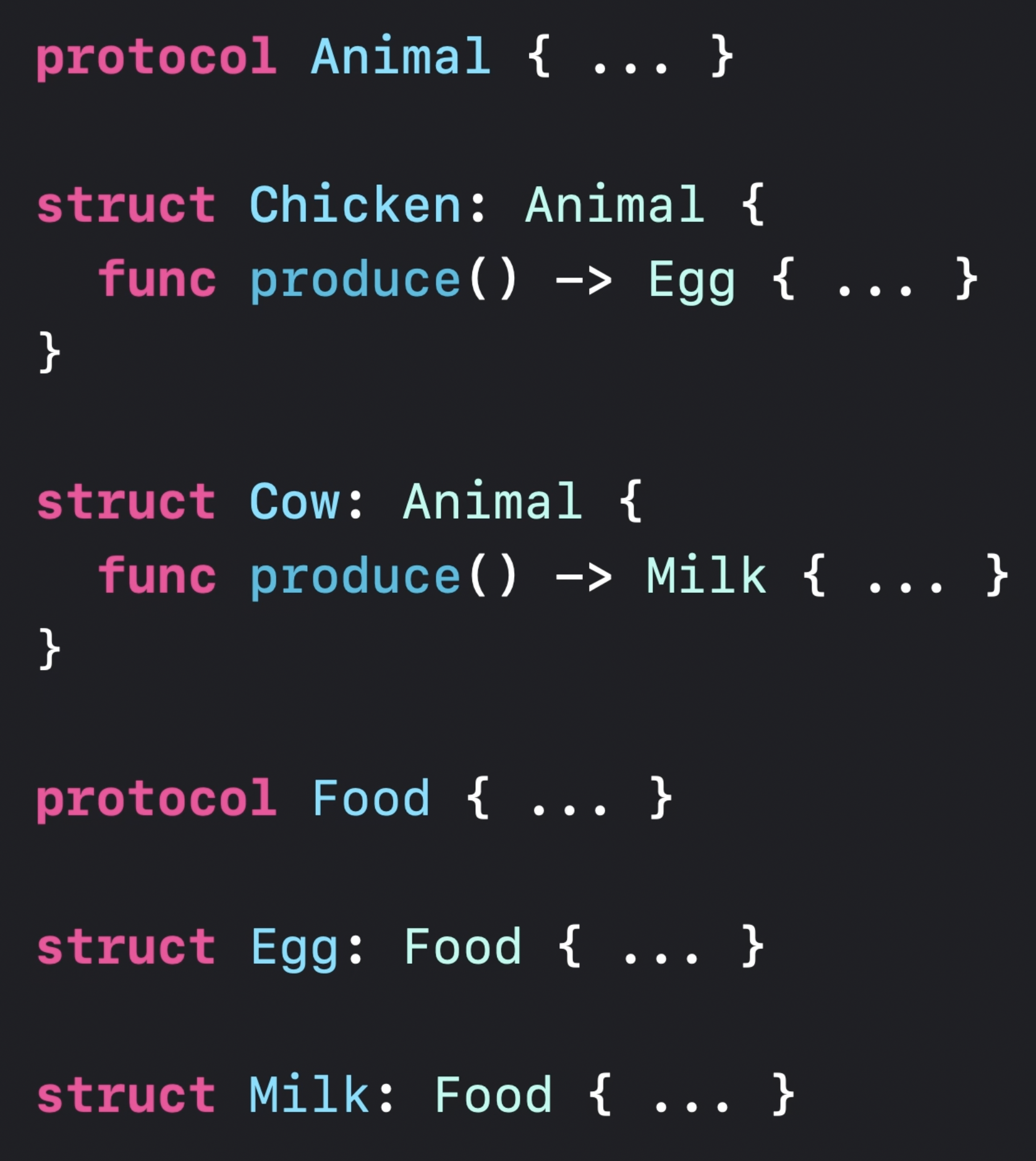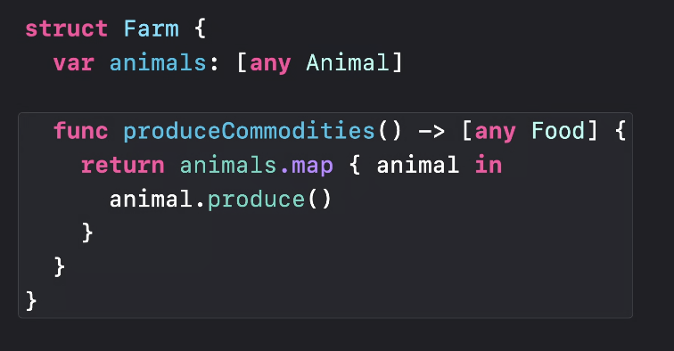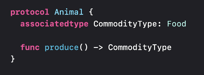 이 경우 Cow에 대한 produce() 메서드는 우유를 반환하는데, 우유는 Animal protocol의 associated CommodityType의 upper bound인 'any Food' 안에 저장될 수 있다.