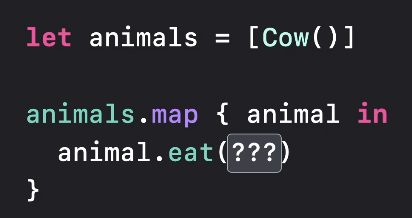 Animal이 구체적으로 어떤 타입인지 명확하게 결정되지 않기 때문에([any Animal]이기 때문에) 인자로 전달되는 FeedType도 명확하게 결정할 수 없다.