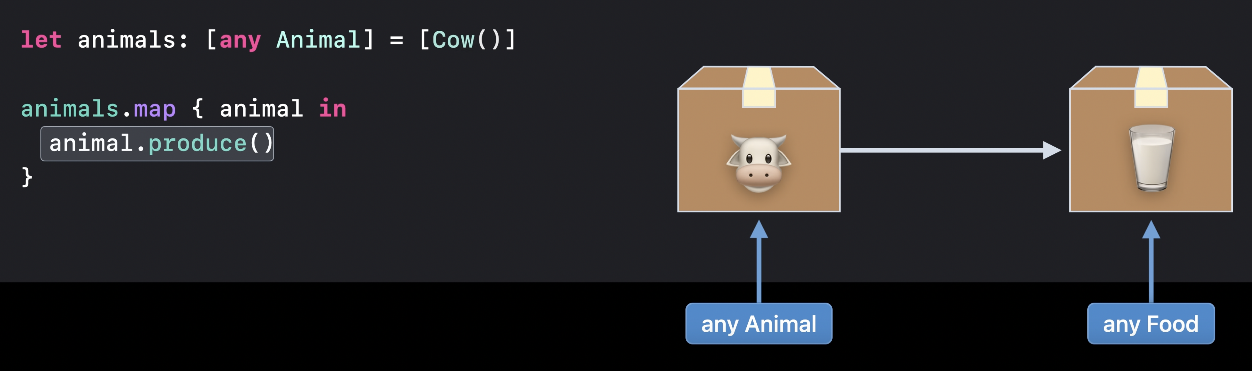 이 예제에서는 런타임에 Cow를 보유한 'any Animal'에 대해 produce()를 호출한다.