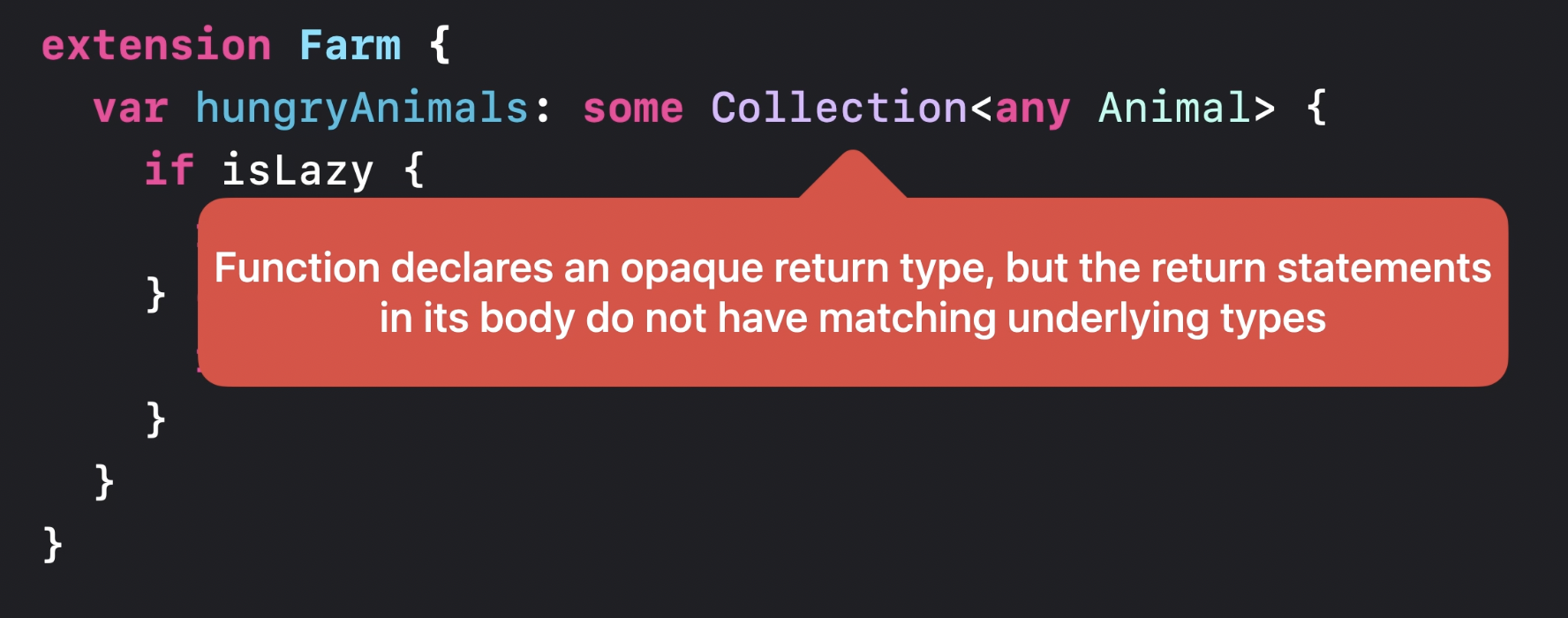 하지만 some은 underlying type이 fixed되는데 두가지 return type이 반환되기 때문에 에러가 뜬다.