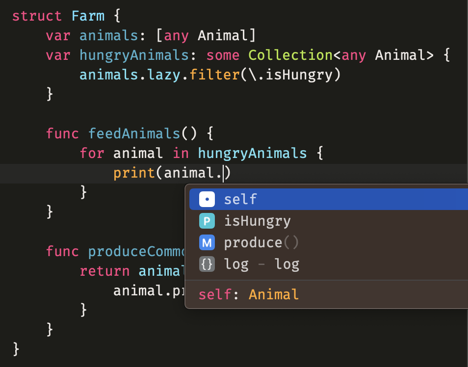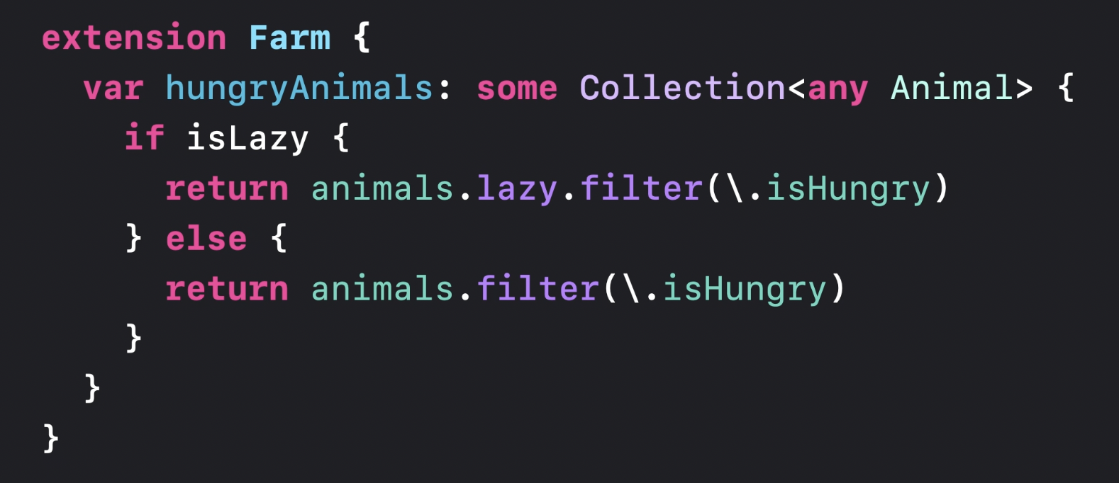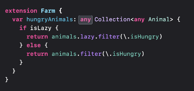 var hungryAnimals: LazyFilterSequence<[any Animal]> {