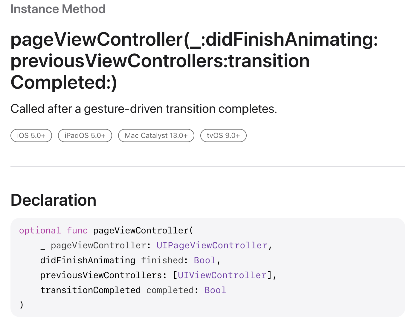 - 파라미터를 보면 pendingViewControllers, transition될 예정(pending)인 view controllers들이다. 우리는 해당 배열에서 첫번째 값을 가져오면 그것이 곧 targetVC다. targetVC를 알면 배열에서 해당 값을 찾아 index를 찾을 수 있다.
