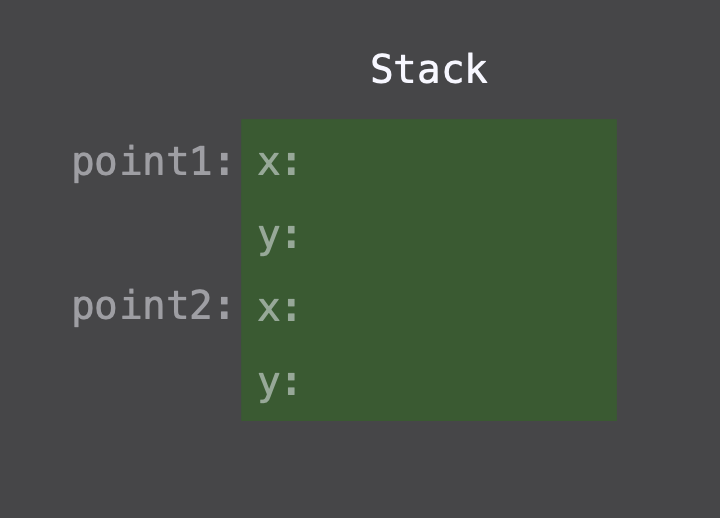 Stack에는 Point1과 Point2에 대한 reference가 저장된다. Heap에 할당될 메모리에 대한 참조이다.