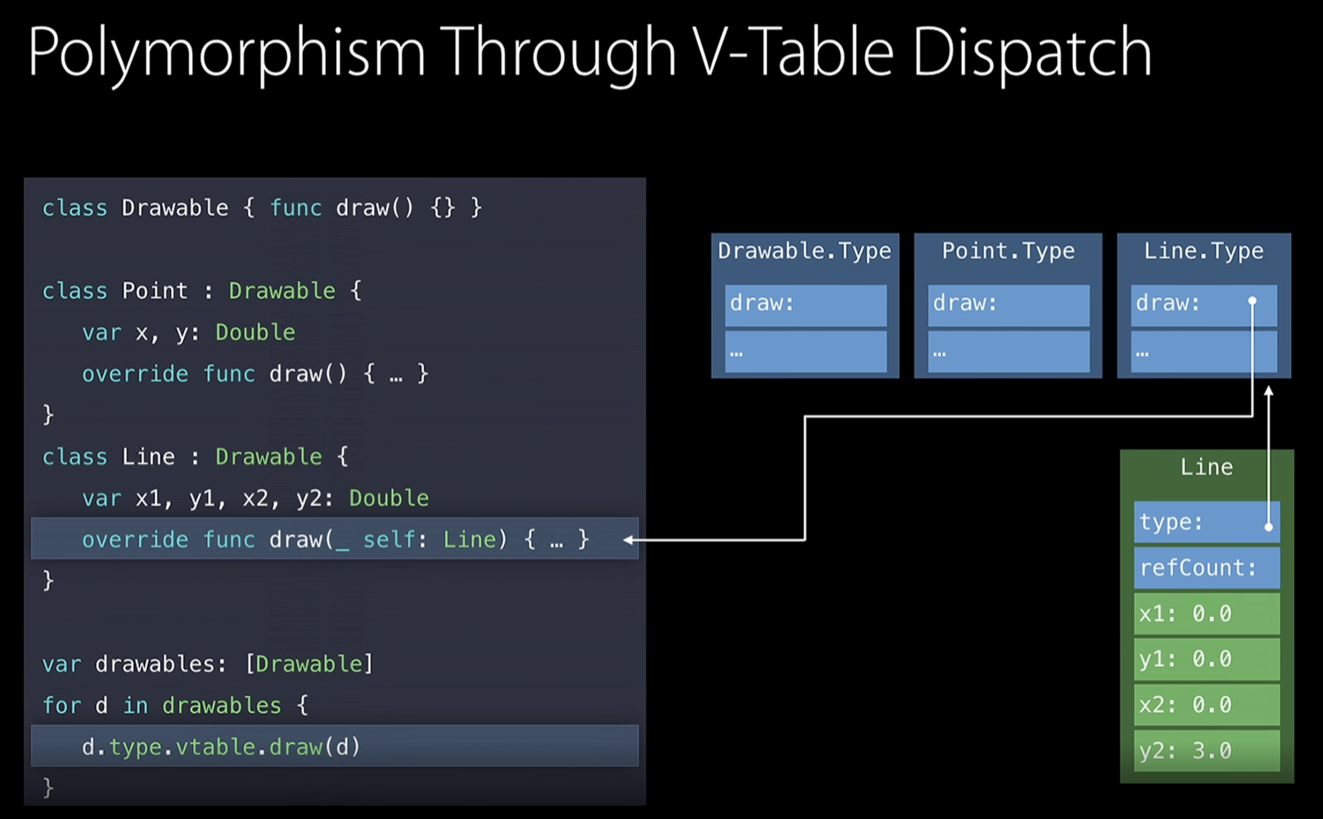 - 우리가 draw를 호출할 때, 컴파일러는 draw의 정확한 implementation을 향한 포인터가 담긴 virtual method table loopup을 생성한다.