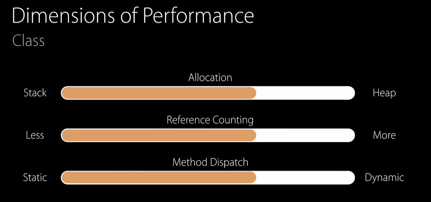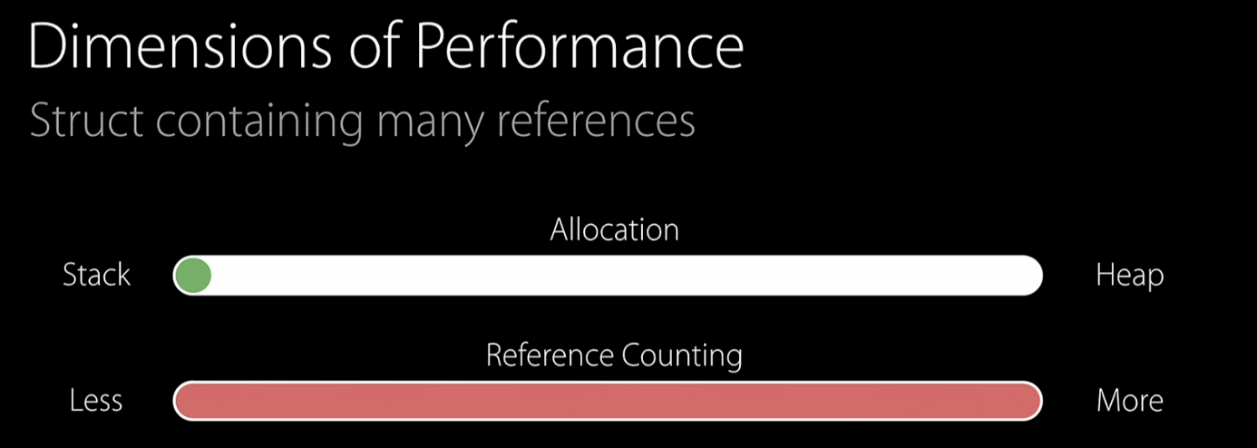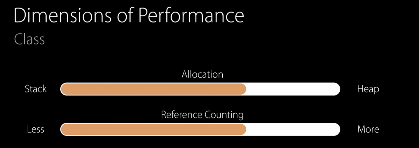 위에서 예제를 통해 알 수 있듯이, Class는 Heap에 저장되기 때문에 Heap allocation이 필요하고 따라서 struct보다 비용이 더 많이 든다.