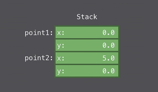 우리가 point1을 point2에 할당할 때도 그저 copy되는 것이고 point2는 Point1과는 독립적인 인스턴스이다. 이건 value semantics로 알려져있다.