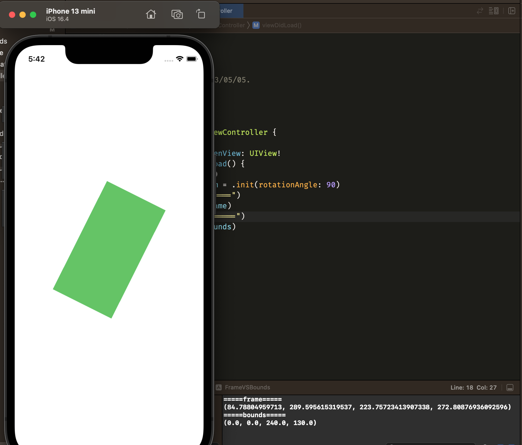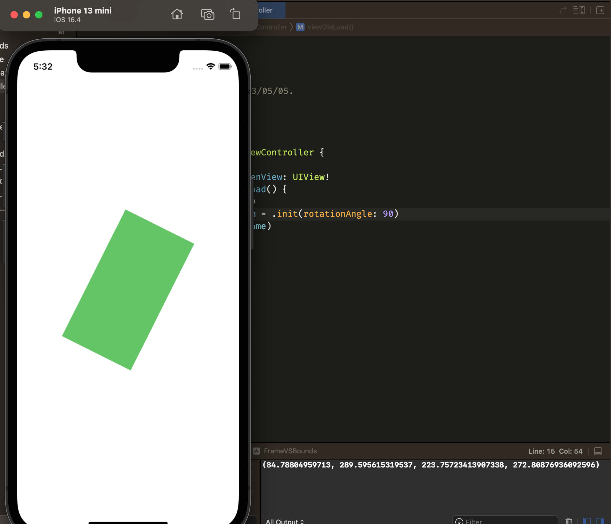 만약 이 때 뷰를 회전시키든 뭘 하든 내가 처음에 줬던 넓이와 높이 값을 알고 싶어!라고 한다면 그 때 사용할 수 있는 것이 Bounds입니다.