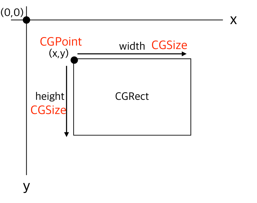 이제 iOS에서는 어디에(CGPoint타입의 origin) 얼만큼의 사이즈로(CGSize타입의 widht와 height) 사각형을 그릴지 알 수 있게 됩니다.