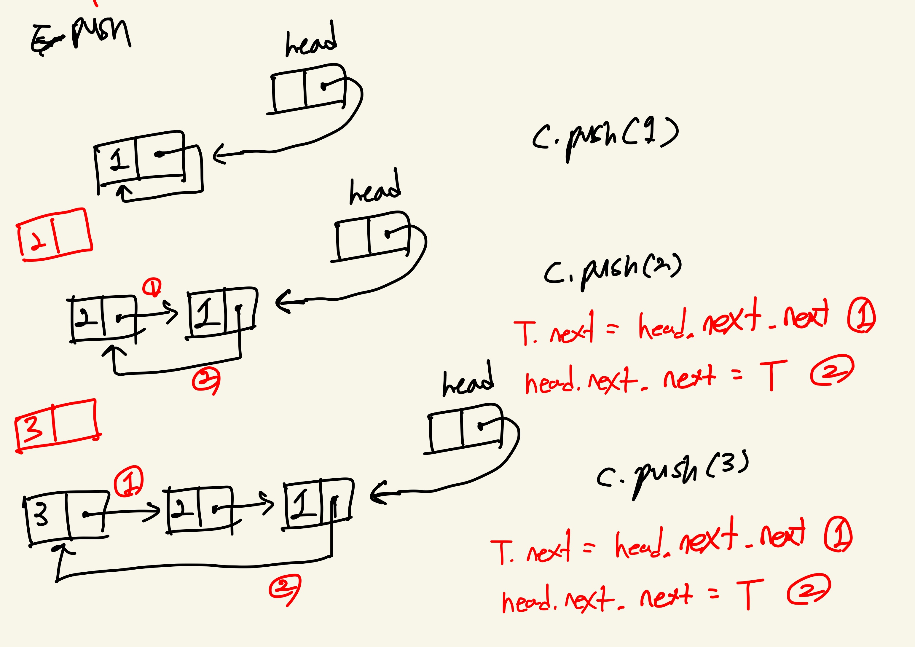- 마지막 노드의 next는 첫번째 노드여야하기 때문에 T를 가르킴으로써, 맨 앞에 넣는 작업 완료.