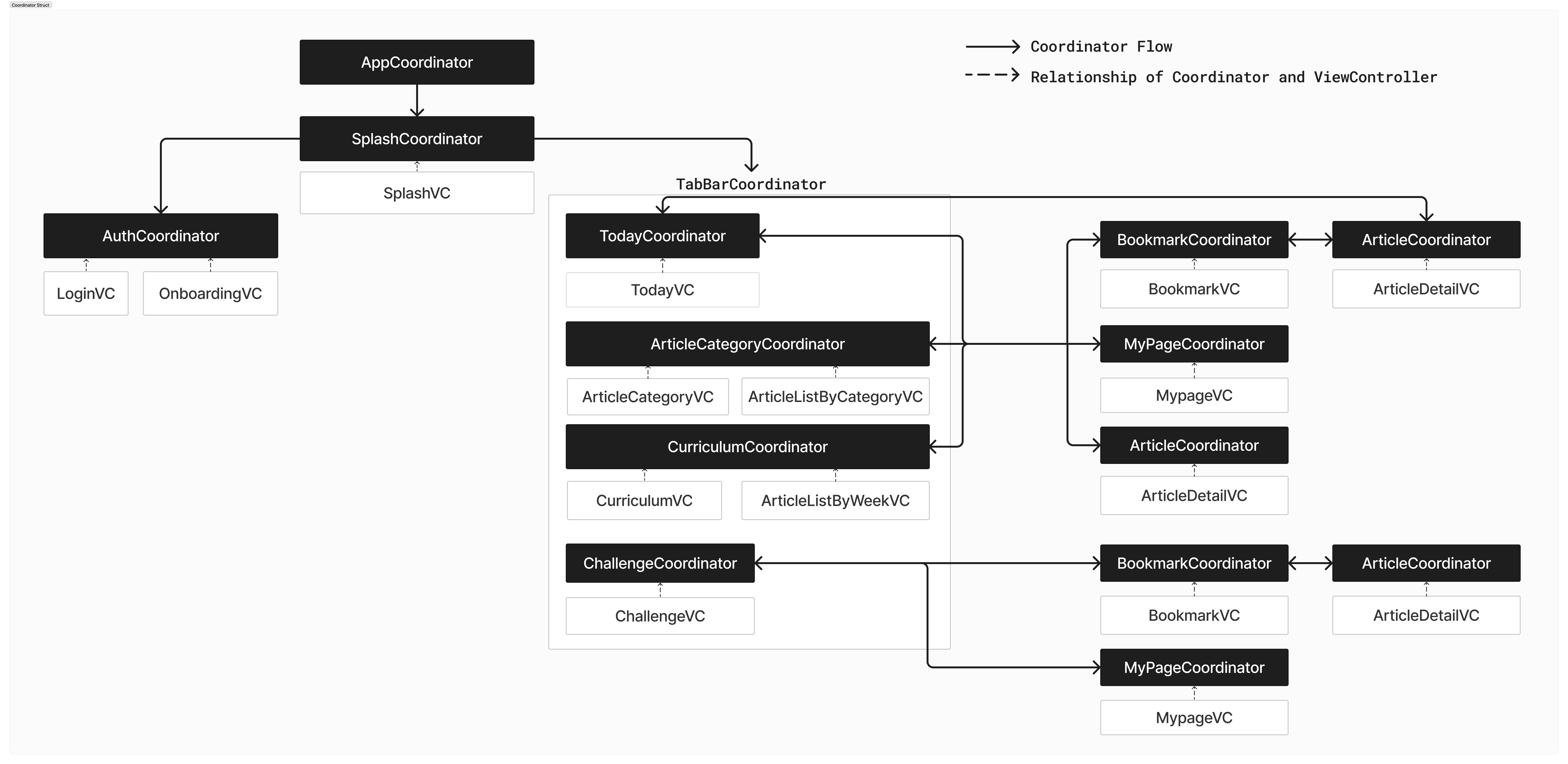 이 때 TabBarCoordinator는 정말 단순히 Coordinator를 묶어주는 컨테이너의 역할만 수행합니다. 예를 들어서 TabBarCoordinator안에 Today, ArticleCategory, Curriculum, Challenge Coordinator들이 있지만, 이 Coordinator들의 parent는 TabBarCooridnator가 아닌 SplashCoordinator입니다.