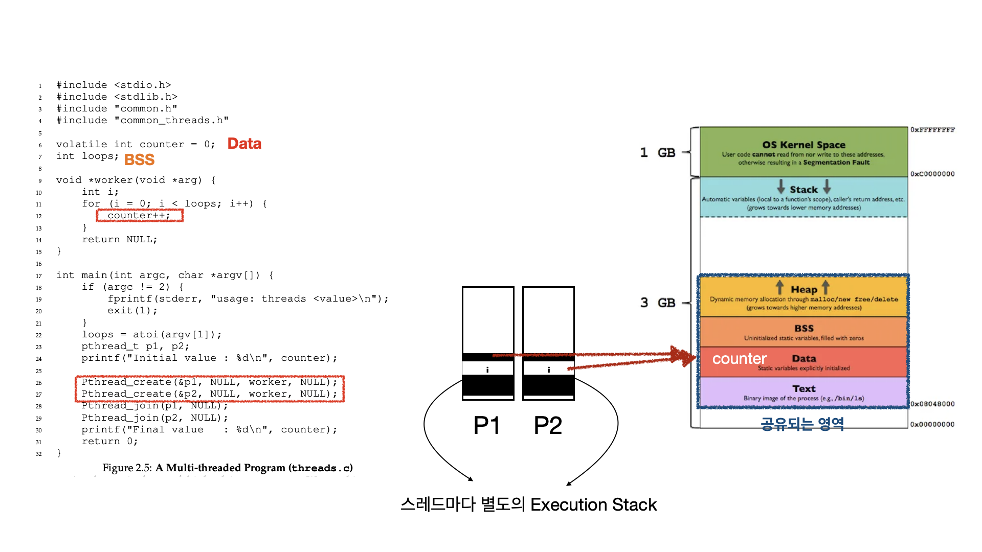 그렇다면 프로세스 안에서 스레드간에 메모리에서 공유하는 부분은 Text(Code), Data(+BSS), Heap 영역이 됩니다.