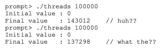 우리가 의도한 결과인 20만에는 전혀 못미칠 뿐더러 매번 실행할 때마다 예측할 수 없는 다른 결과값이 나오고 있습니다.